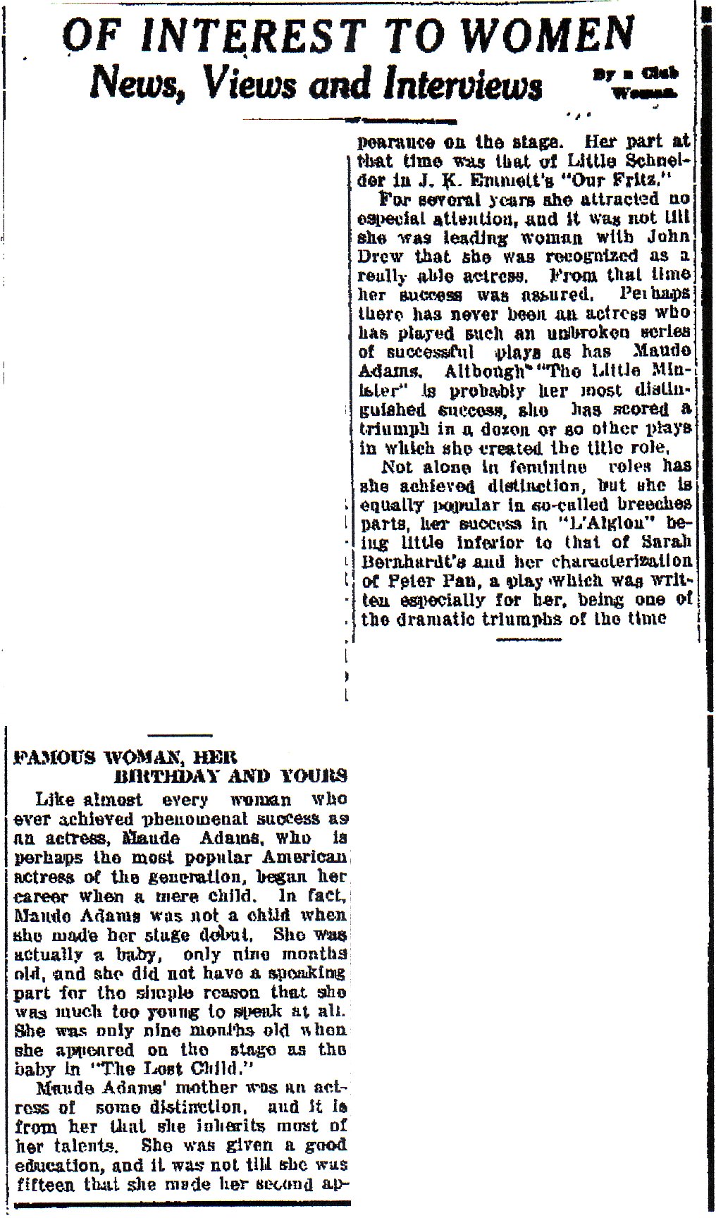 "Now that's the sort of a leading lady I like to have! ' he exclaimed.-'She wants real beer and she shall have real beer.',And real beer they did have at every performance after that. Although," laughingly added Mrs. Adams in telling this story, "for the benefit of the many W. C. T. U. admirers that my daughter has to-day I want to state quite clearly that she did not drink any of the beer. I saw to that. But the others did,, and enjoyed it mightily after their long cold-tea drought; and every night when they came to the toast one or another of the actors would wink at Maudie and repeat, "Ere 's to yer,' under their breath."