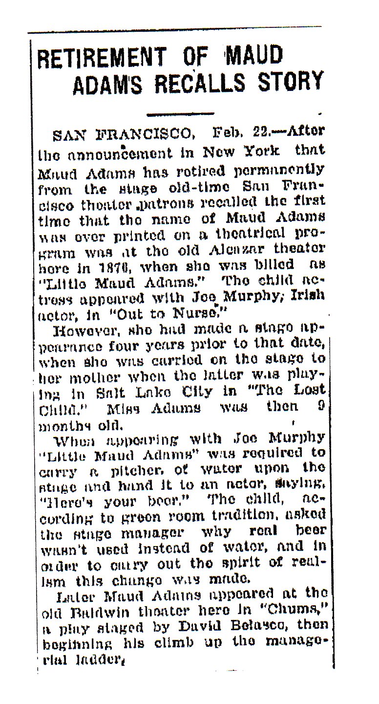 "During the following season Maudie was six then - she appeared with B. J. Murphy in a play called Out to Nurse. By this time the young lady had become quite a stickler in stage affairs. Like any other youngster with a healthy appetite, she cordially despised those Barmecide feasts known as stage banquets. Frequently, when from the wings she used to watch me acting in some play in which there was an elaborate dinner or supper scene, she used to say to me when I came off the stage, 'Yes., muffer, but they didn't give you nuffin real to eat.' Of course stage banquets in those days had not reached their present state of realism., so you couldn't blame Maudie for feeling a trifle disappointed. But her first opportunity to express her sentiments on this matter came during the run of Out to Nurse. Mr. Murphy was tremendously fond of the child, and used to pet and indulge her in loads of ways. In one scene Maudie had to bring on a pitcher of beer to Mr. Murphy and some other members of the company, the pitcher had always been filled with cold tea,-that dreadful dose which passes muster on the stage for anything in the liquid line from sparkling champagne to deadly poison,-but with the little girl's adventure began a new regime.