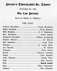 The Lost Paradise opened in New York at Proctor's Twenty-third Street Theatre on November 16, 1891, reached its one hundredth night on February 2nd, and ended its run on March 5th. Among the many fine performances, it is worth noting that this was Maude Adams's first decisive New York success: