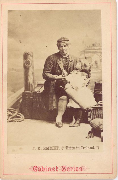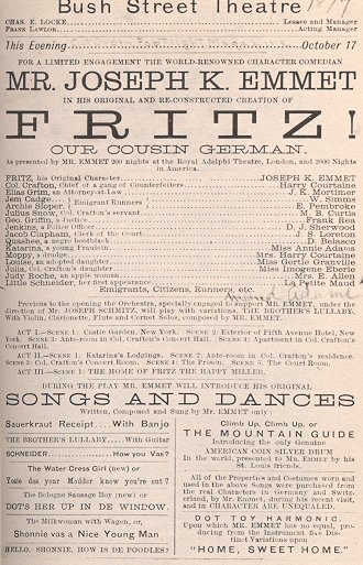 The show marked no advance over the earlier Fritz efforts, and Emmet usually incorporated his by then famous "Lullaby" in the recognition scene. New songs included "The Bells Are Ringing," "The Cuckoo Song," and "The Love Of The Shamrock." This edition ran eight weeks and returned in May for an additional run. By this time, the shape of Emmet's future career seemed clear to him, and he was eager to convey his intentions to his audience. In the program for the Park Theatre for the week of November 14 he inserted a "Notice To Public." The notice ran, "It is Mr. EMMET'S intention to make an alteration yearly in his character of 'FRITZ,' by giving him sketches and incidents of his experience during his travels around the world, and introduce new scenes and music, making, if not an entire new drama, an entertainment not to be excelled." Possibly excluding the last value judgment, Emmet was true to his word. Emmet was plainly astute enough to gauge accurately his audiences' tastes, and he was determined enough never to veer from his stated plans. Even after his death, his son and others would be able to thrive for a number of years by rigidly following this 1879 dictum.