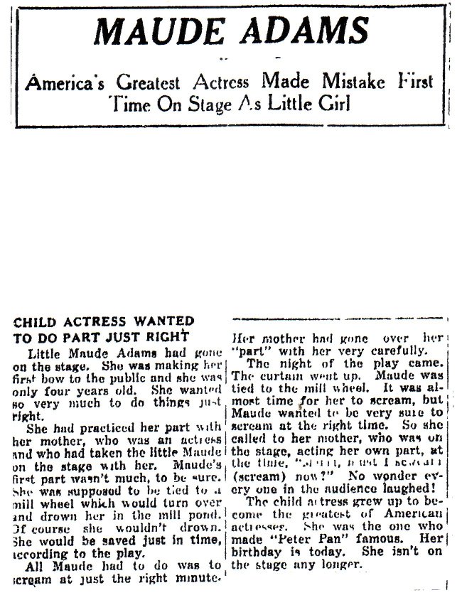 "..on October 17, 1877, one month shy of her fifth birthday, Maude launched her own professional acting career, appearing as Little Schneider in Joseph K. Emett's popular comedy, Fritz."" (Maude Adams, an American Idol: True Womanhood Triumphant in the Late-Nineteenth and Early-Twentieth Century Theatre, doctoral thesis, 1984, Eileen Karen Kuehnl)