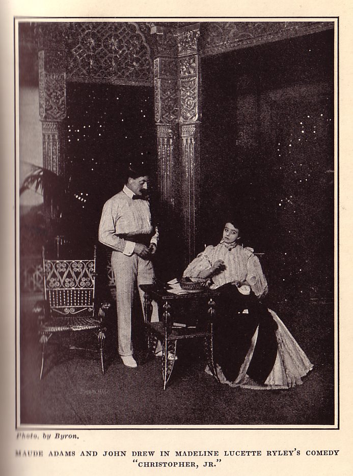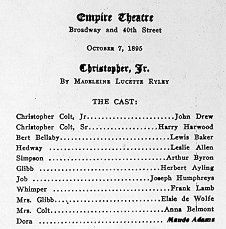 Frohman's response to That Imprudent Young Couple 's debacle was to offer a hasty mounting of Madeleine Lucette Ryley's Christopher, Jr. ( 10-7- 95), Empire). Actually, the mounting was not all that hurried, for Drew and his fellow players had been offering it on the road. Since Christopher Colt, Jr. ( Drew), has mistakenly entered a young lady's stateroom, fallen asleep, and remained there overnight, he has been forced to marry the girl. Once ashore, however, he conveniently forgets her--an easy thing to do since he never really got a good look at her. Although he lives a costly man-about-town life, he takes a room in an attic and pretends to poverty when his father comes to visit him. But his father's mission is to insist that his son marry, and, for farcical purposes, the old man will not listen to his son's explanation of why he cannot. The father ( Harry Harwood) introduces the bride-elect, Dora ( Maude Adams), and Christopher proceeds to make himself as undesirable as possible. Of course, it turns out that Dora was the girl on the ship, and all ends happily.