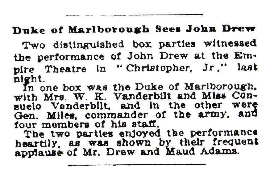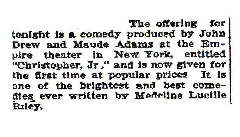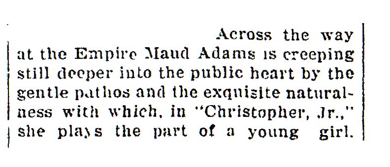 "That huge theatre was almost empty that night, but for all that the small audience fairly got up on its hind legs and fired salvoes after salvoes of applause at the actress. The run of Christopher,Jr, at the Empire lasted until the following February."