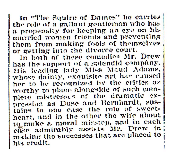 Note that the play advertisement on the left does not even mention Maude Adams, just Mr. Drew's "Admirable Company." The second article does talk about "Maud" Adams in a very positive form.