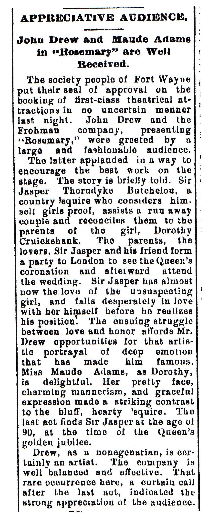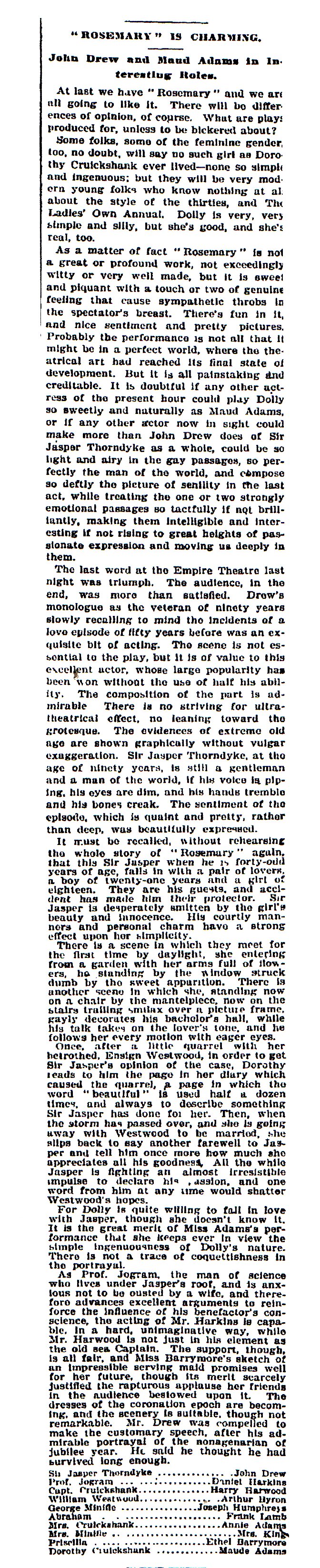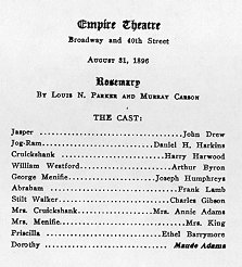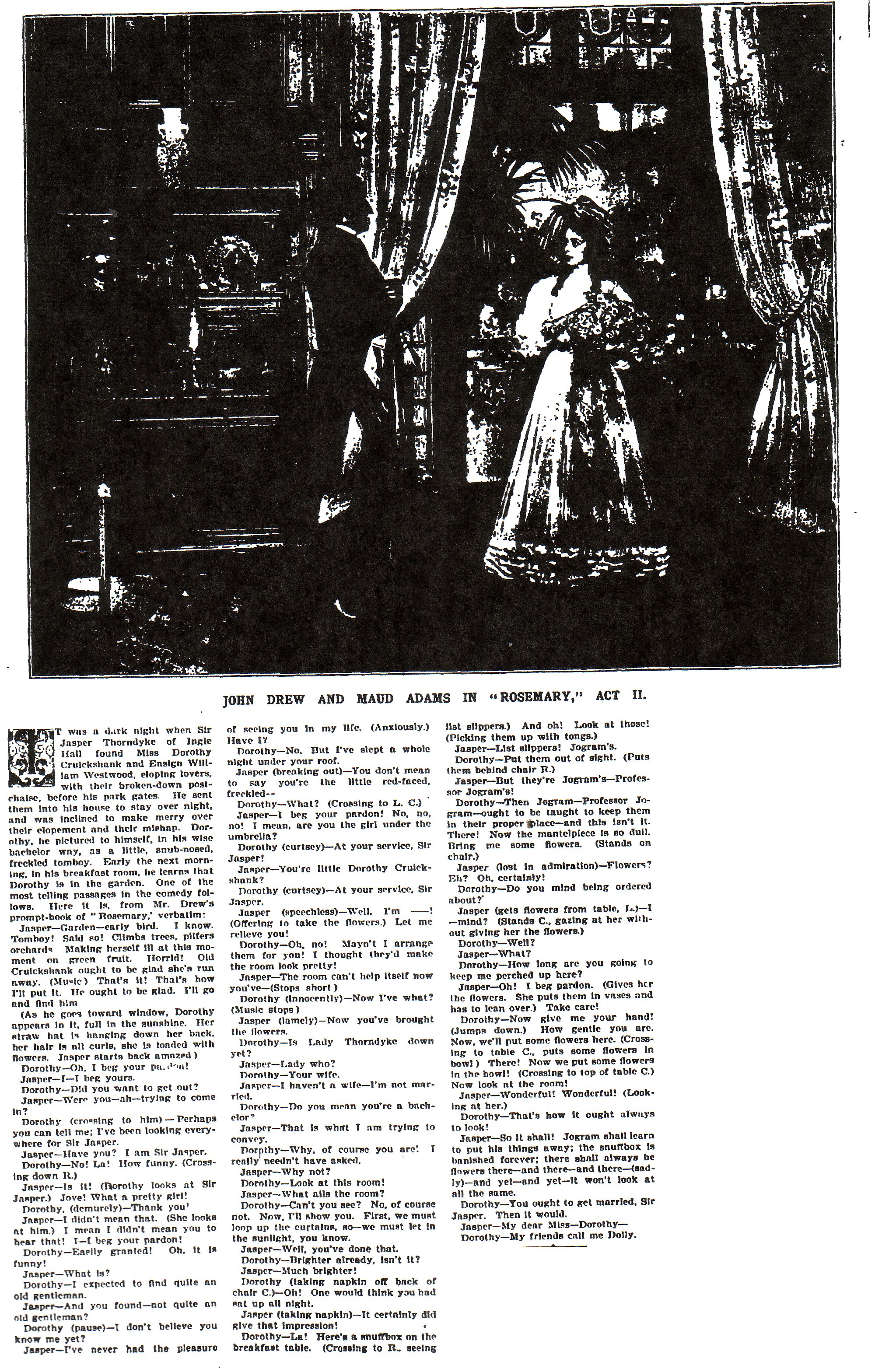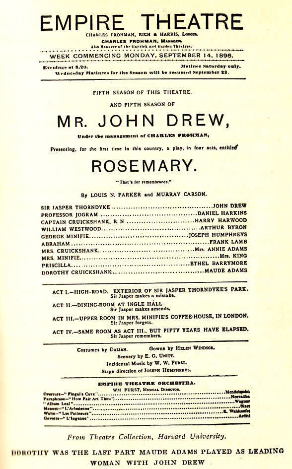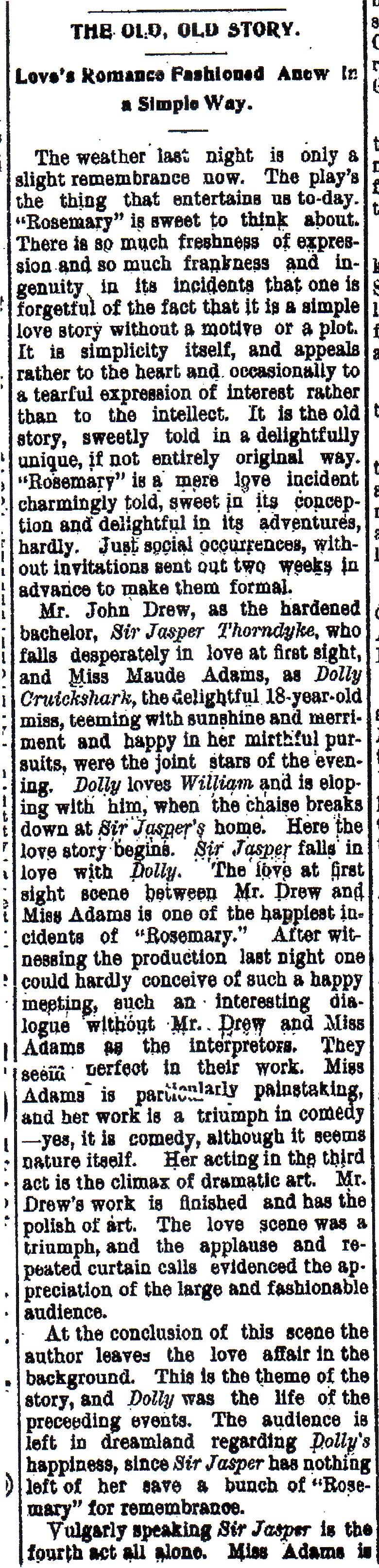 "Early in the following September Mr. Drew produced Rosemary, and Maude Adams' popularity grew suddenly from a fad into a furor. Mr. Drew scored a notable success as Sir Jasper, but it was Maude Adams' Dorothy Cruickshank that made the great success."