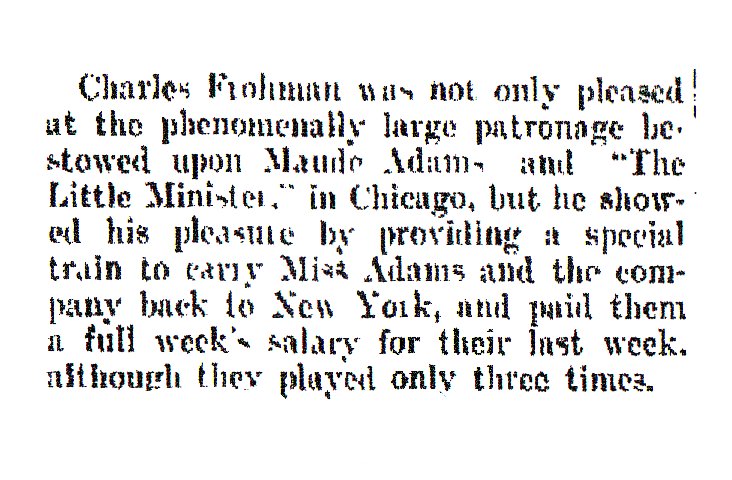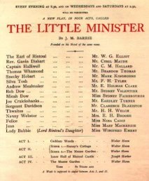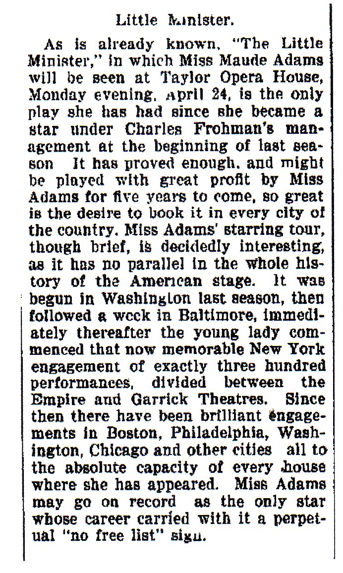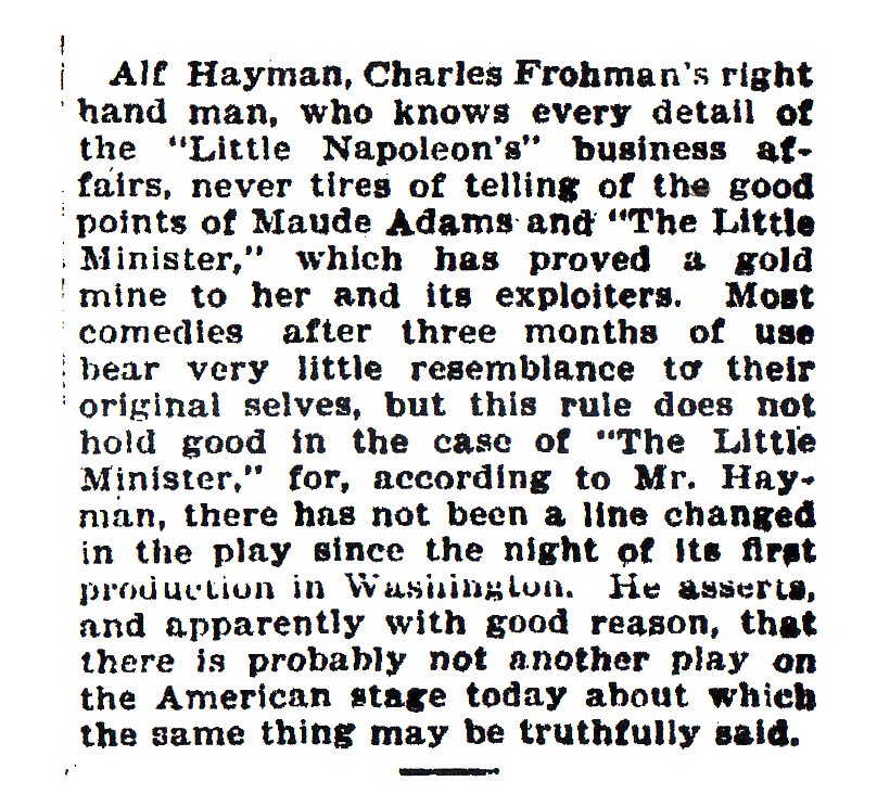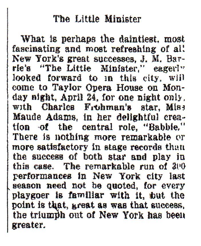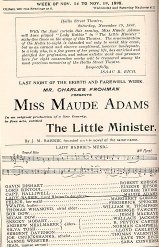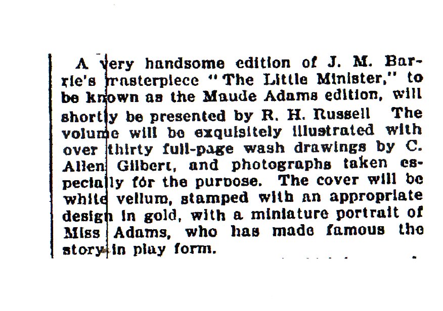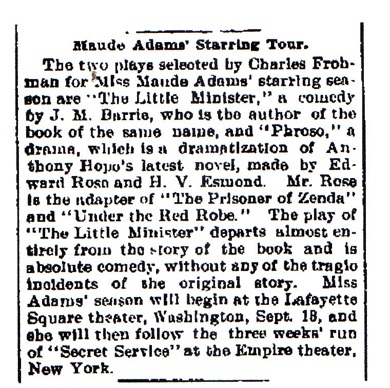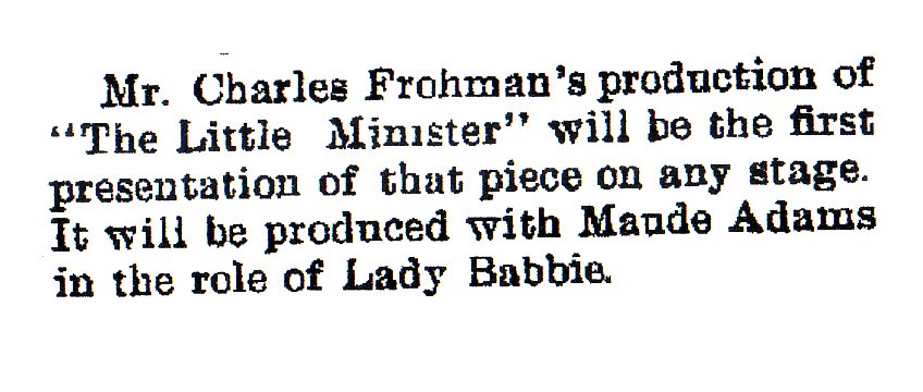 "Yet for him (Charles Frohman) it (The Little Minister) was still the vehicle which he had chosen for making Miss Adams a star, and to the last he was cabling suggestions for changes that might remove even a lingering public doubt. Her part was getting bigger and bigger, and she was being given more and more of the other characters' lines; but he was still rather worried that she wasn't in the title-role, and but for the value of the novel would almost certainly have altered the name of the play as well.