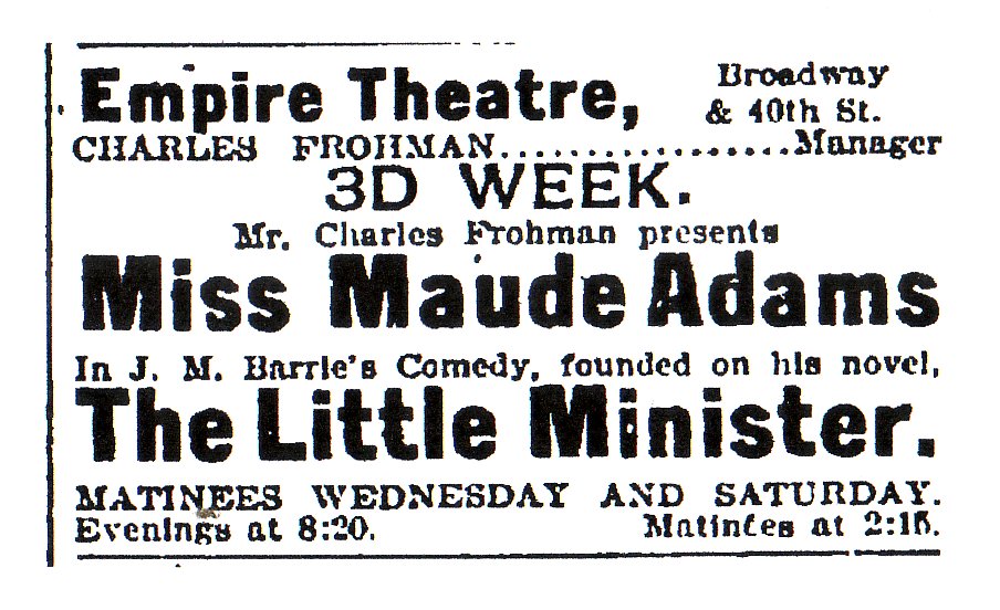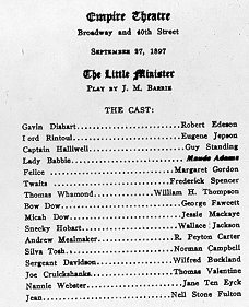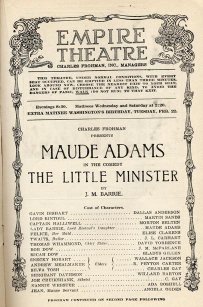 As a result of the American visit, Frohman produced in New York, in September, 1897, the first dramatized version of The Little Minister. Maude Adams, whom he also met at this time and who was the original Peter Pan in the United States, took the leading role of Babbie.