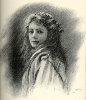 After meeting a poor reception in Washington during a tryout engagement, Miss Adams brought The Little Minister to the Empire on September 30, 1897. This date was, in a sense, historic. It marked the inception of that amazing relationship between the American public and the star which, beginning as a one sided love affair, developed into a worship without precedent or subsequent parallel. Miss Adams was twenty-five, winsome rather than pretty, slight, frail and girlish. Her lilting speech and muted laughter, the delicacy of her tread, the graceful swiftness of her movement, gave her a quality that soon was described as "otherworldly." Though intensely feminine, she made a curious impression of elusiveness, as if she had an elfin strain. A decade later Barrie was to say of a play that he had written for her, "I could see her dancing through every page of my manuscript." In that play, What Every Woman Knows, he gave her lines which defined her appeal for him, and certainly for the public: "Charm is the bloom upon a woman. If you have it, you don't have to have anything else. If you haven't it, all else won't do you any good."