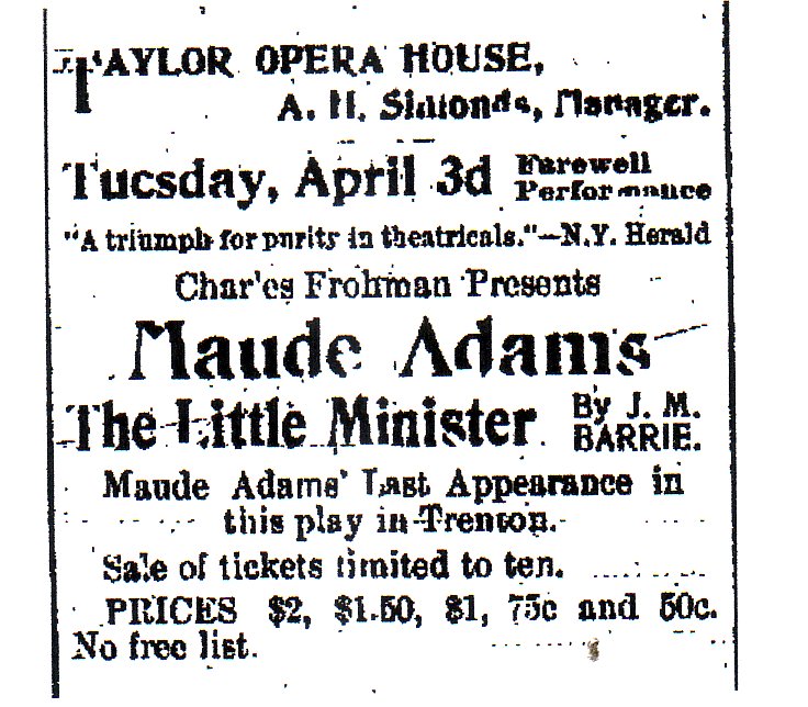 de Adams [ne Kiskadden] ( 1872-1953) was born in Salt Lake City and was carried on stage by her actress mother, Annie Adams. She was still a youngster when she played her first speaking roles in small California towns before moving to San Francisco. She came east in 1888, where she performed in such plays as Lord Chumley, A Midnight Bell, and All the Comforts of Home. After a time she was John Drew's leading lady until Charles Frohman elevated her to stardom. At this time stage historian Lewis Strang wrote, "In figure almost painfully slight and girlish; her face elfishly bewitching in its very plainness; her eyes large, blue and roguish; her hair ashen brown and delicately rippling; unusually gifted intellectually, and with a personality of the most persuasive magnetism, Maude Adams is to-day the most popular woman on the American stage."