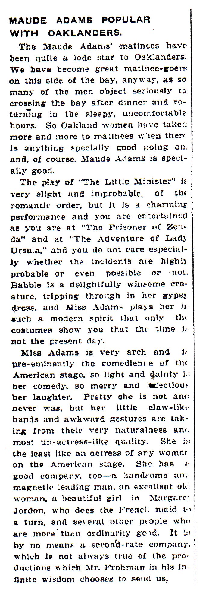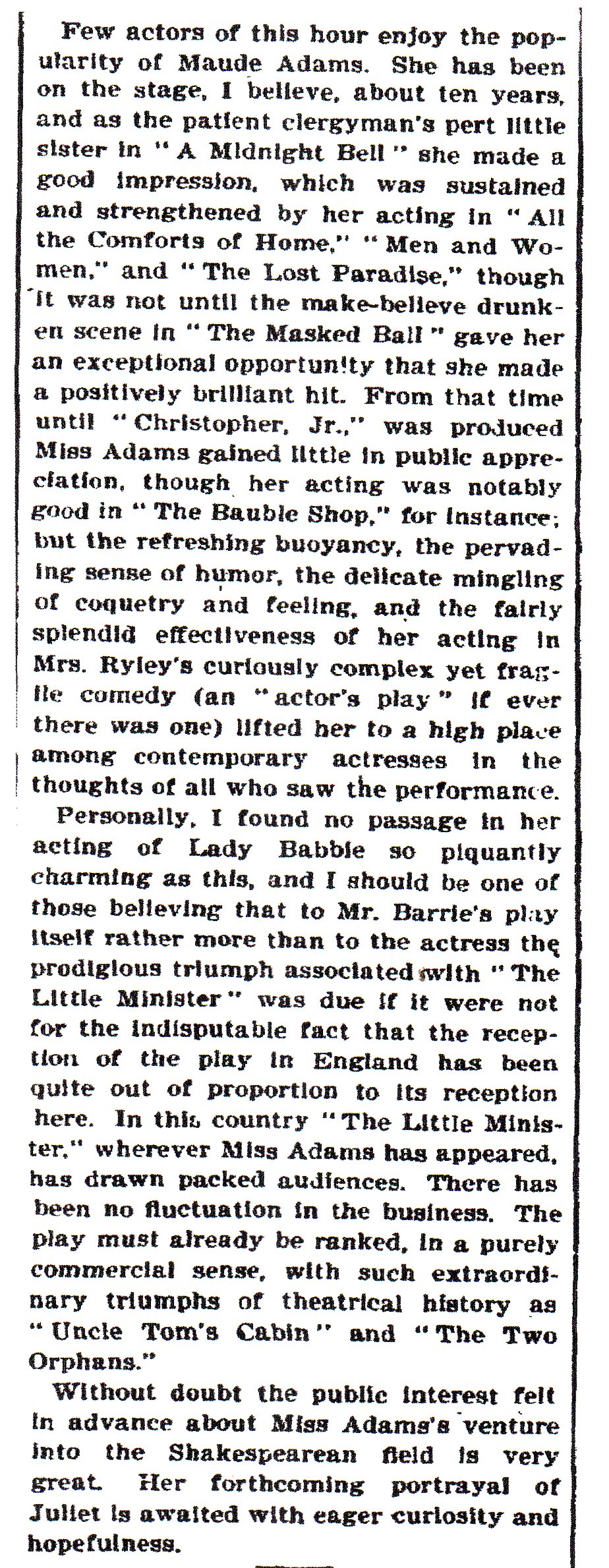 "Rarely had a star been born under more auspicious circumstances. Miss Adams threw her whole soul into her work in this role. And well she might, for Lady Babbie was a part after her own heart. She is simply a little devil who loves a joke even more than she loves her lover, but Barrie had contrived two or three serious little scenes in the midst of the fun, which shows that after all the Lady Babbie is deeper than she seems. It is a pity, though, that Mr. Barrie chose to end his play so flippantly. There is no necessity for it. After collecting all the ingredients for a charmingly sentimental ending he brings in a splash of broad comedy which almost robs the finale of its charm."