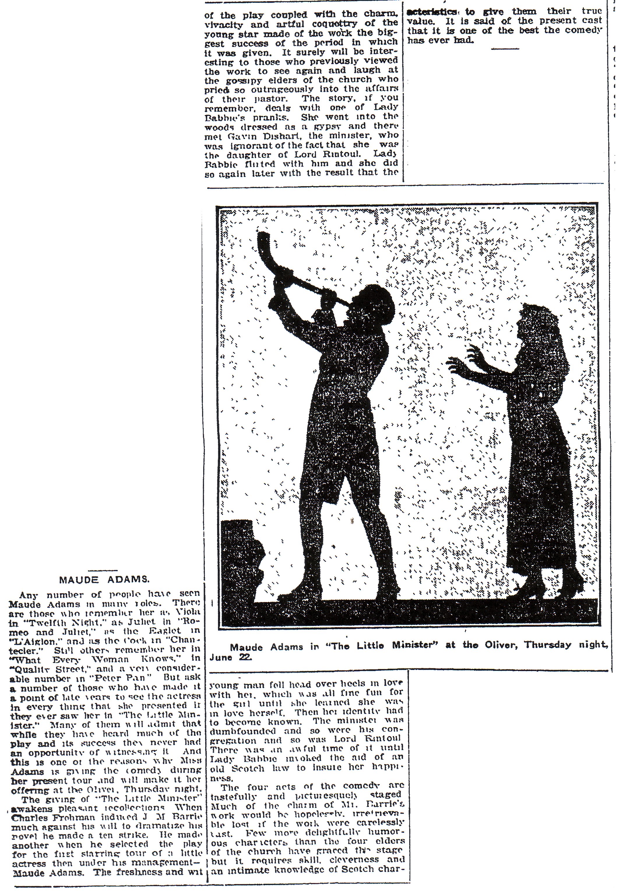 “The Little Minister is still the most profitable play in this country, and the larger share of credit for this must be due to the actress who 'created' Babbie, because the play has had no such vogue in England as it has enjoyed here. The charm of Mis Adam's acting in this role is, indeed irresistible. it also defies analysis. In a merely technical sense her acting has seemed more satisfying in other roles. But in no other has she exerted so strong a spell upon the public." New York Times, Jan. 10, 1900