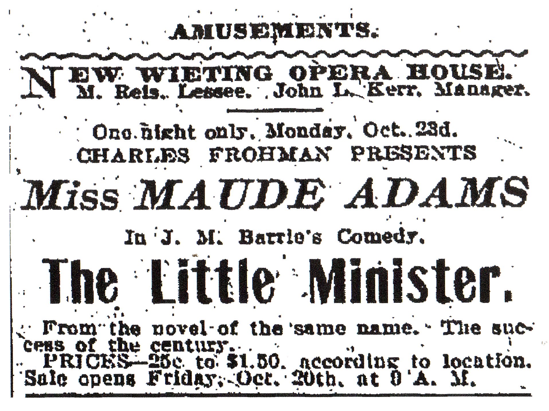 Maude Adams had such success in this last play that Frohman decided to make her a star, and he secured for her use a dramatization by J. M. Barrie of the latter's own story, "The Little Minister." Produced September 27, 1897, with Maude Adams as Lady Babbie and Robert Edeson as Gavin Dishart, the piece ran at the Empire for 300 consecutive performances, after which Miss Adams went on tour with the piece.