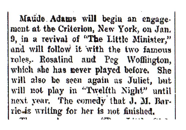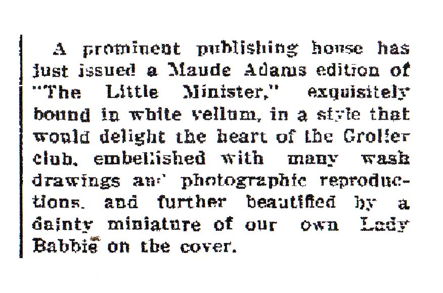 “It is some time since Miss Adams hs played such a sympathetic and satisfying role as that of Lady Babbie in the dainty Barrie comedy...Miss Adams is the same slender, winsome, witching Babbie, and her appeal is as strong as it used to be." New York Times, Dec. 27, 1904