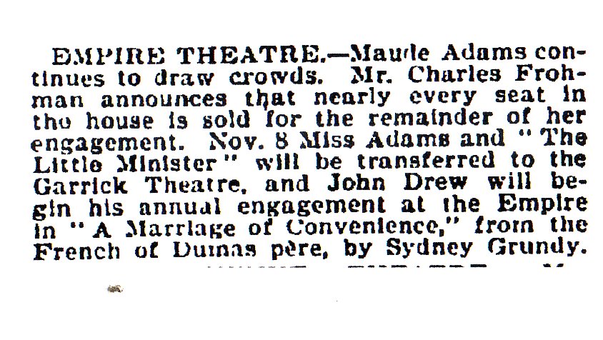 He therefore launched Miss Adams in "The Little Minister" at the Empire and booked John Drew at Wallack's in "A Marriage of Convenience." His decision was amply vindicated, for both scored successes.