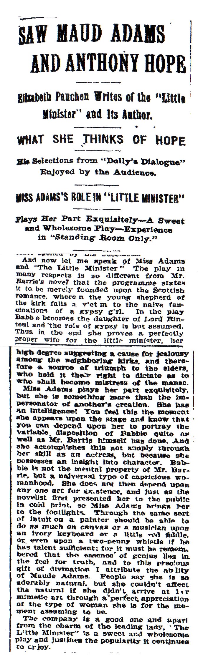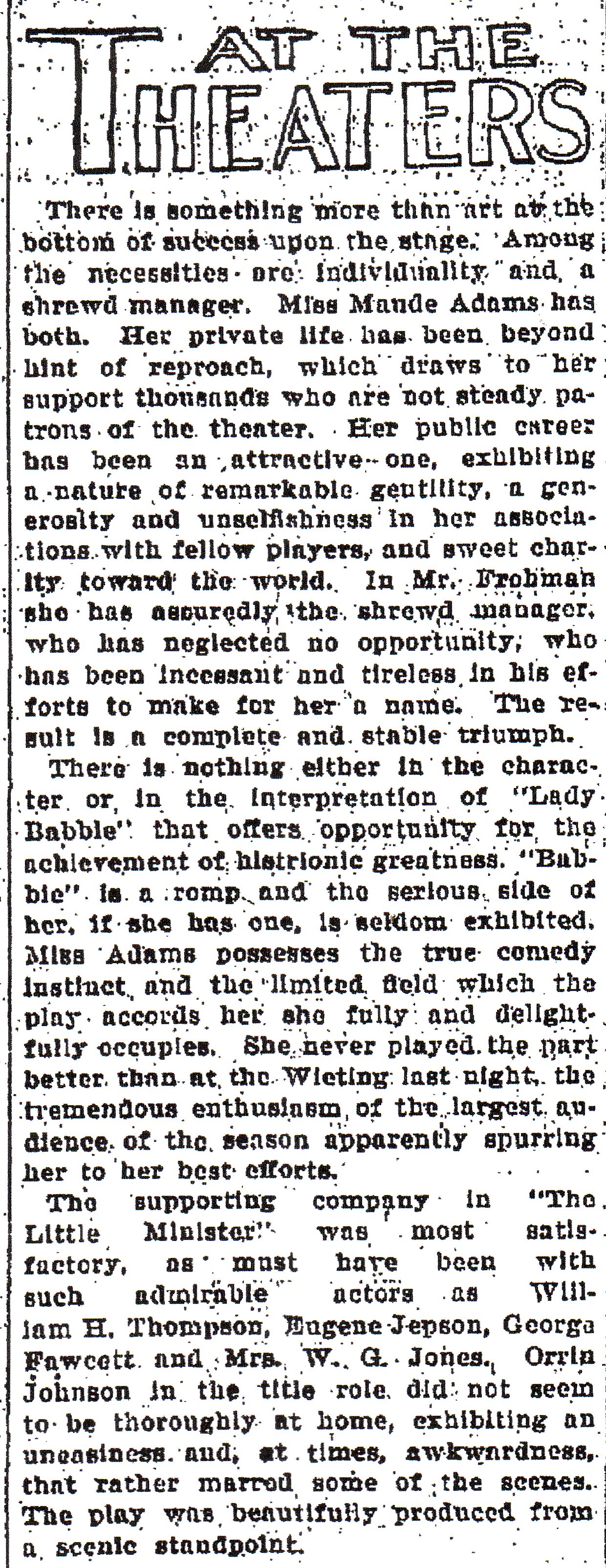 "The fact that the play pleased the audience has nothing to do with the question, because the audience of last night obviously gathered with the determination to be pleased or to die in the attempt. Miss Adams will be a better Babbie in a week hence. She was clearly nervous. Her sudden alternations of seriousness and gaiety will gain ease and effect. That Miss Adams knows what should be done in such places no one doubts."