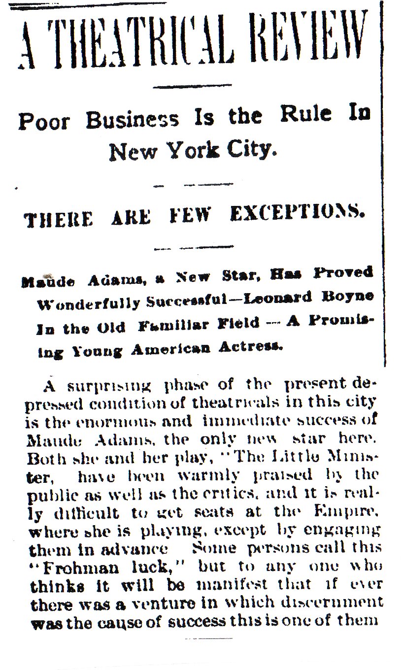 “The enthusiasm over Maude Adams at the Empire last night was remarkable. It was well enough known to followers of theatricals in this city that she was a favorite actress with a winsome personality, a dainty method, a sweet manner, and considerable talent; but even the long accustomed attendant upon new ventures of the stage were not prepared for any such ovation as was given to her upon her debut as a 'star.' She was applauded upon her emergence two minutes by the watch, and that is far longer than anybody who has not timed such things would suppose. At the end of the first act, before either the new play or Miss Adam's part in it had amounted to anything in particular, the curtain had to be raised four times to answer the demand of the enthusiasts." New York Sun, Sept. 28, 1897