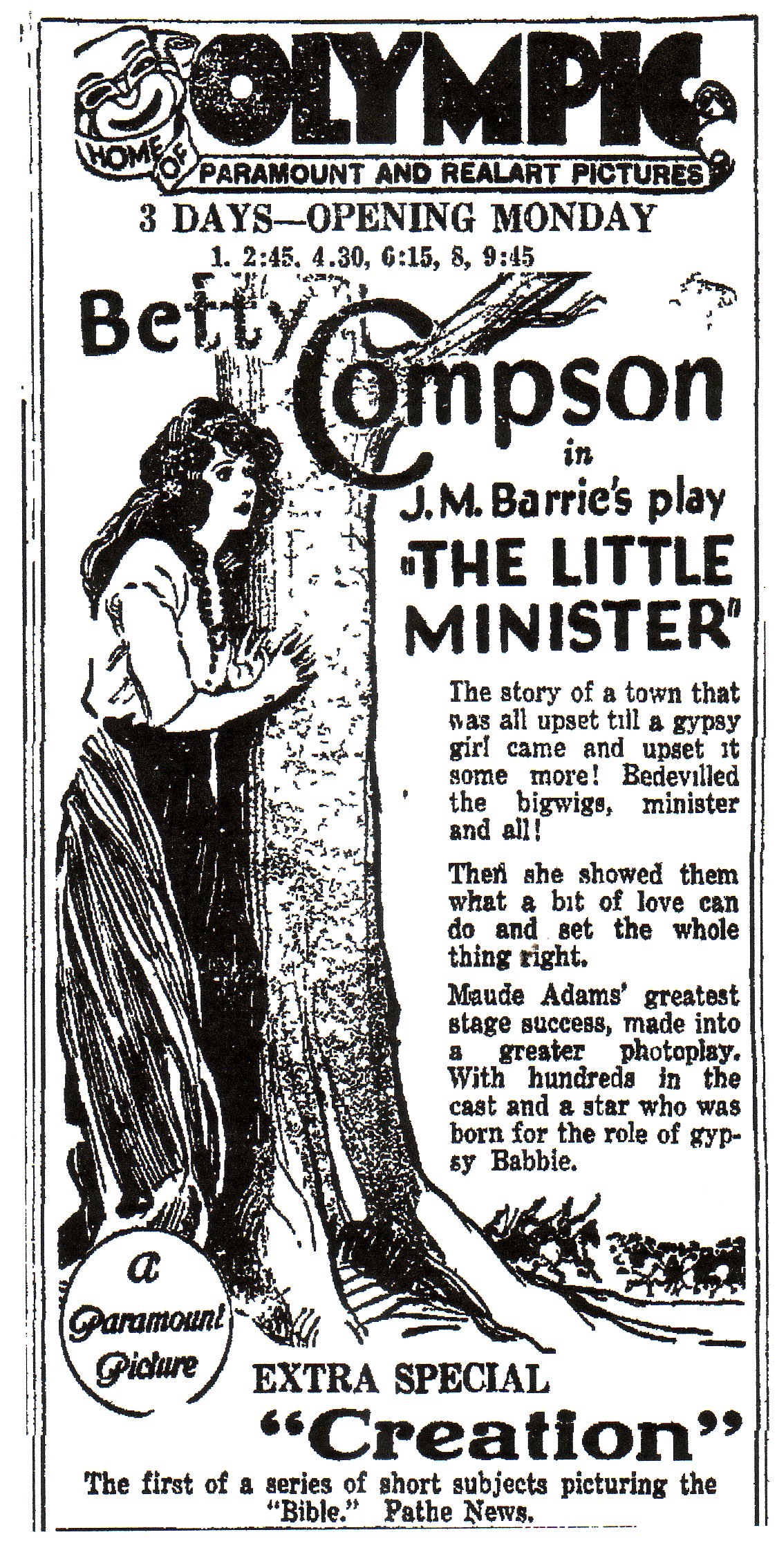 "A dramatization of Barrie's novel of the same name. The title character is Gavin Dishart, twenty-one year old preacher who has established in influence in Thrums, a small weaving town in Scotland. His youth, shortness of stature and occasional gaiety encourage the village to erect a maternal sort of vigilance over him. They watch everything he does and then interfere or criticize with neighborly efficiency. The plot concerns the little minister's romance with Babbie the gypsy. From the day when she enters his life, with her gypsy dress, dancing feet, madcap tricks and dazzling eyes, Gavin is a lost man. Although he tries to resist and preaches three castigating sermons on "woman,' it is to no avail. The village is outraged by the infatuation and Babbie nobly decides to give him up. She will marry the elderly Lord Rintoul. But on the eve of her marriage she hears a false report that Gavin is dead and seeks him out in alarm. They decide on a quick marriage ceremony, but are thwarted by the arrival of Lord Rintoul and others anxious to prevent the marriage. Gavin and Babbie are separated. Gavin once more wins the affection of his people and their support, and the way is finally smoothed for his union with Babbie."