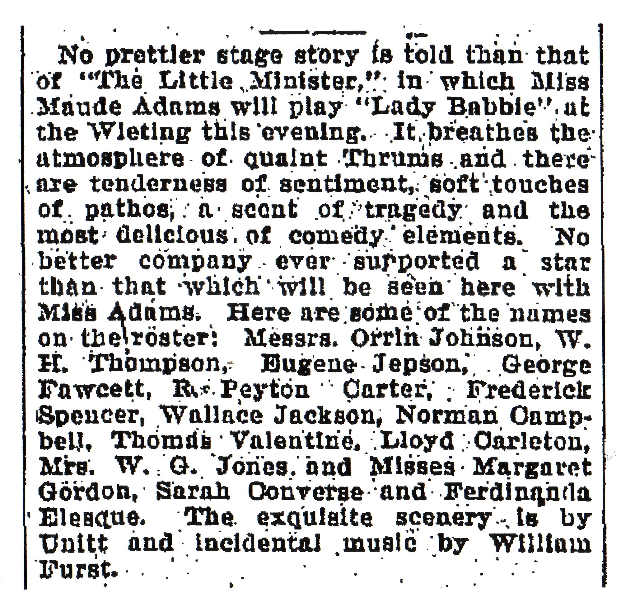 "Whether his work be a novel or a play, Barrie possesses the God-given knack of touching things with spirit light. This little play has a plot scarcely wider than your little finger, and yet it teems with romance, and there is more real comedy in it than has been shown in all the comic productions in a year. The most ardent admirer of the novel can not find fault with Mr. Barrie for the manner in which he has turned it into a play, nor could Mr. Frohman be criticized for the manner in which he had cast it. The plot of the play wanders far afield from the novel, but the characters are all there, Lady Babbie, Gavin Dishart, and all the prominent citizens of Thrums."