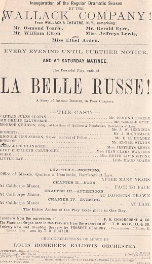 It was Belasco's hope to use La Belle Russe as a spring-board to New York, and with that in mind he had arranged for the engagement at Baldwin's Theatre of two actors from Wallack's Theatre, New York--Osmund Tearle and Gerald Eyre. Shortly after the production of the play he persuaded Thomas Maguire, lessee of Baldwin's Theatre and Belasco's employer, to finance a trip to New York. There Belasco planned to sell the play to Lester Wallack. But Maguire, who claimed a half interest in the piece, proved a stumbling block to the negotiations, and Belasco. ended by selling the rights to Frank L. Goodwin for a modest cash sum. Discouraged at not having succeeded in dealing with the great Wallack, Belasco returned to San Francisco, whereupon Goodwin sold La Belle Russe to Wallack at a considerable profit to himself.