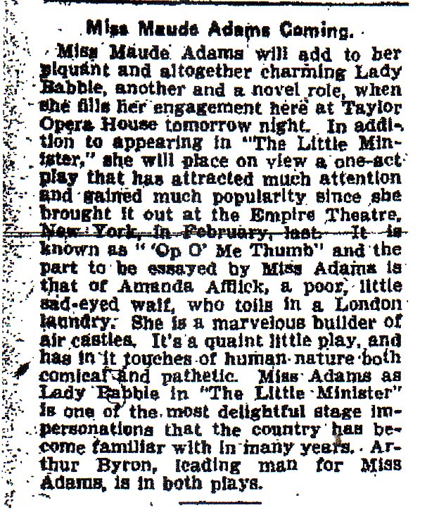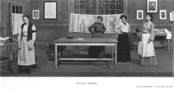 Since late December Maude Adams had been playing in a revival of The Little Minister. As business began to wane, Charles Frohman added a curtain raiser, a second English play, Frederick Fenn and Richard Bryce's 'Op o' Me Thumb ( 2-6-05, Empire). Miss Adams, in a broken straw hat and tattered, ill-fitting clothes, was cast as a laundress who lives in her dream world but is poignantly made aware that no Prince Charming awaits her.
