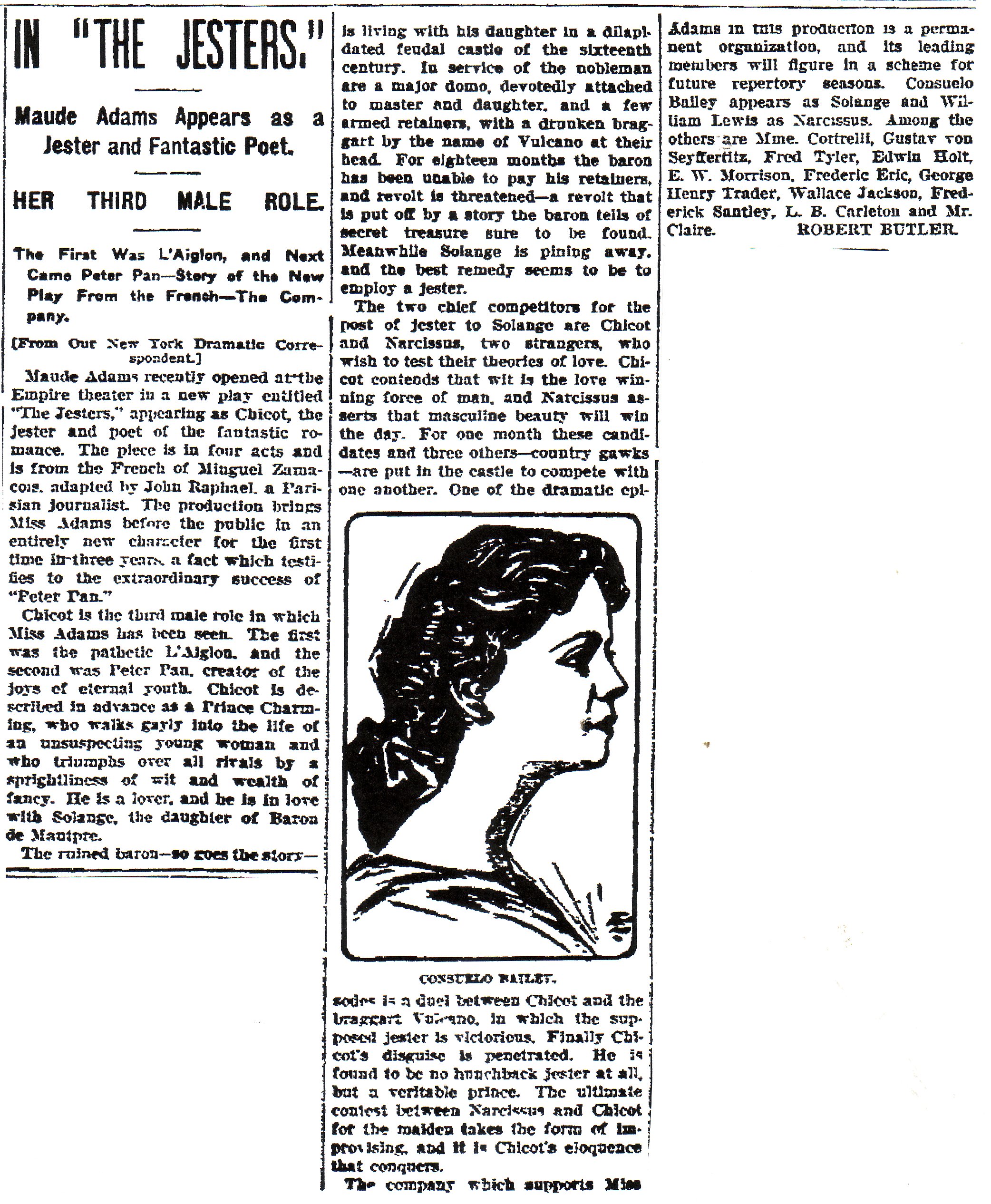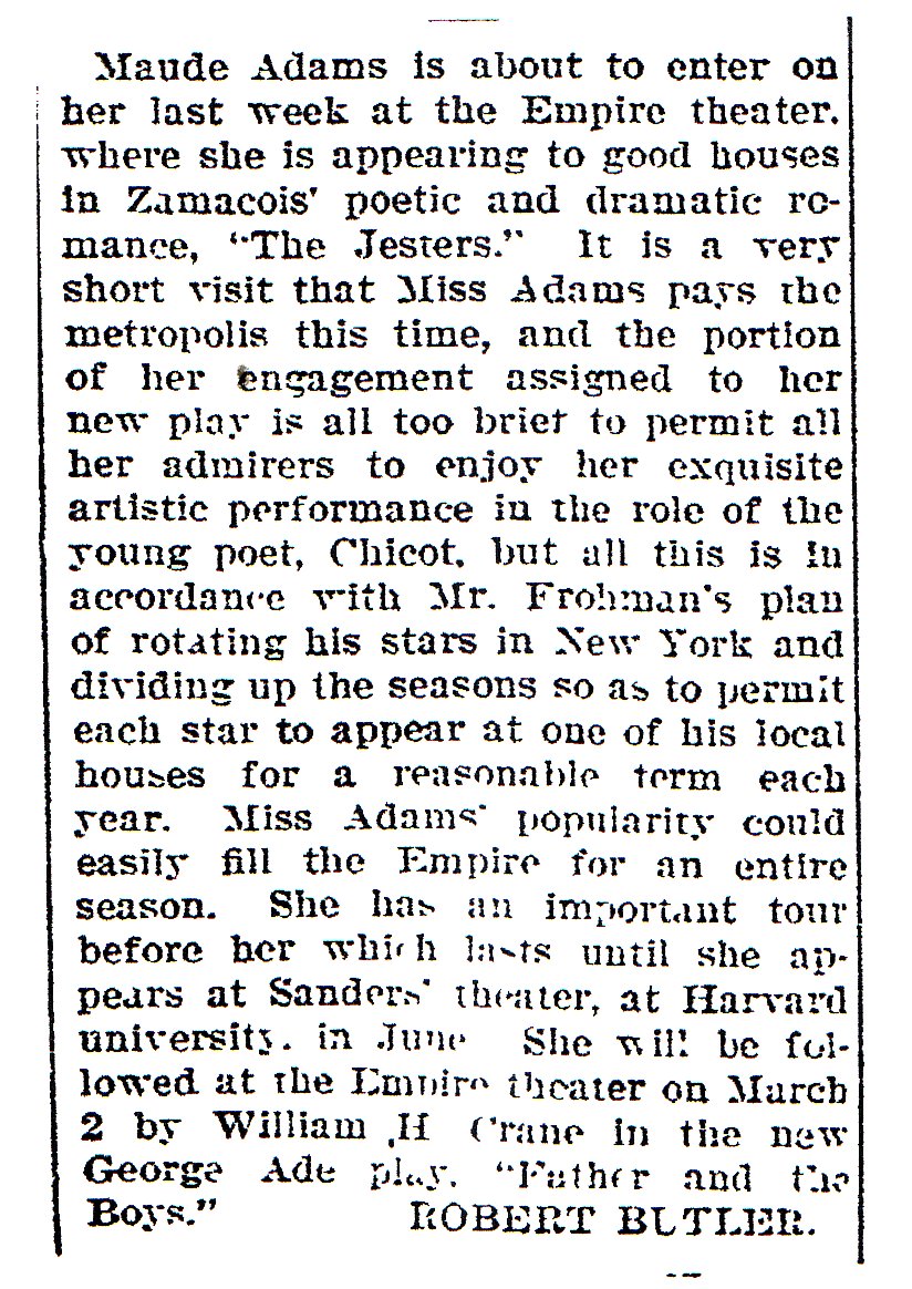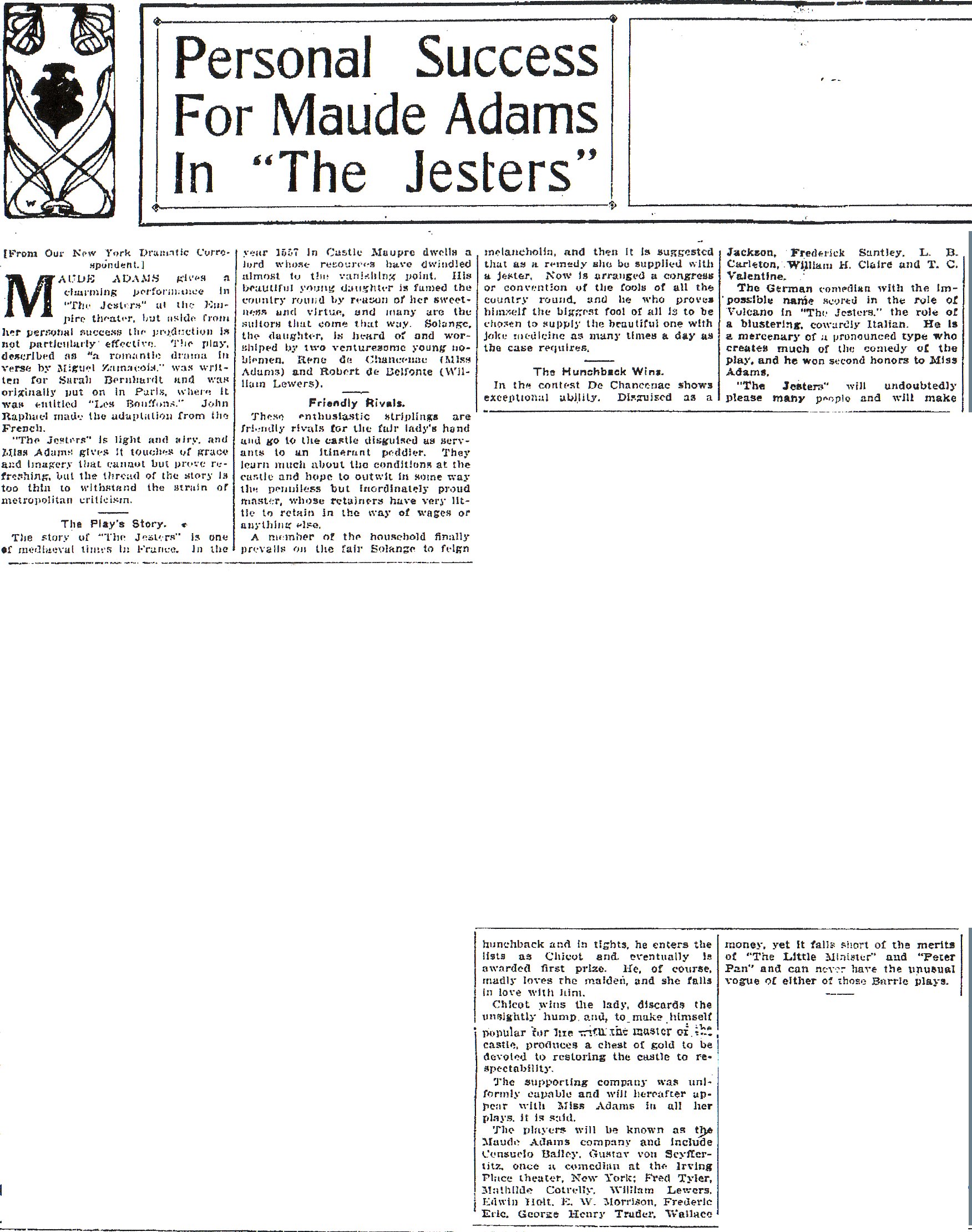 Maude Adams remained America's most beloved actress, so whatever profit Miguel Zamacos's The Jesters ( 1-15-08, Empire) reaped in its seven-week run probably was to her credit. In Paris, Bernhardt had triumphed in the play, but a number of reviewers felt the role of a prince who disguises himself as a hunchbacked fool to court a beautiful princess was unsuited to Miss Adams's more gentle, wistful art. One critic raised another objection: 'Many of her quickly rippled phrases were almost unintelligible at the back of the house, and her habit of changing vowels into curious diphthong sounds-'All my luck, I claim' into 'Ool my luck, I cle-eem'--did not add to the effect.'