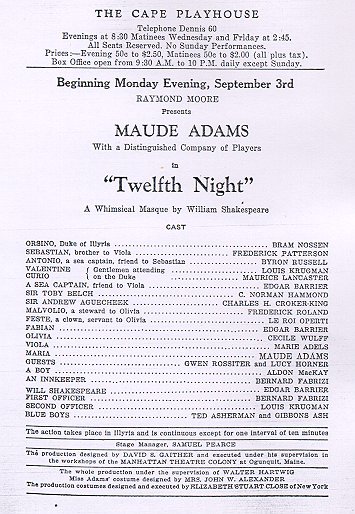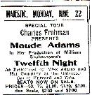 “Of Miss Adam's Viola it is perhaps too early to speak decidedly, as this was the first time that she had acted the part and there is no doubt that further study will round out her conception of Shakespeare's heroine. In many respects the part is well suited to her. There is a simplicity and girlishness in Viola which the actress portrayed so charmingly that even when she did not grasp the character, one could forget it on account of the grace and sweetness which throughout characterized her impersonation.” Boston Evening Transcript, June 4, 1908