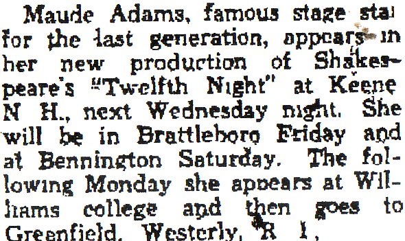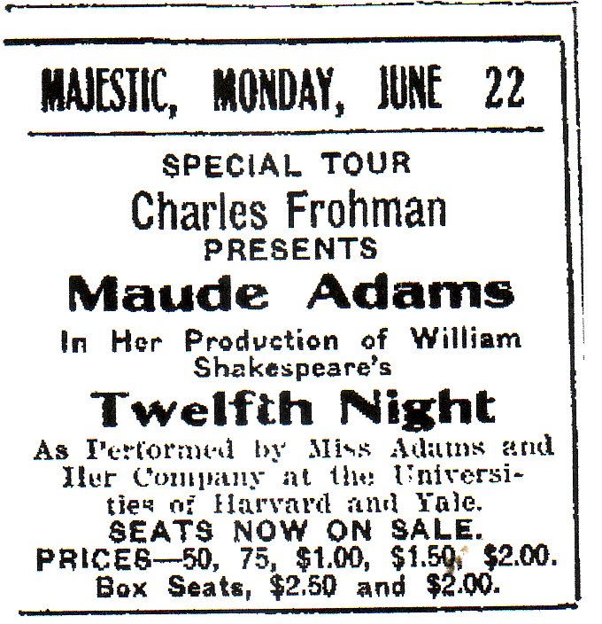 “The primary purpose of this production was educational, but the event turned into a love feast for the popular star.” (Maude Adams, an American Idol: True Womanhood Triumphant in the Late-Nineteenth and Early-Twentieth Century Theatre, doctoral thesis, 1984, Eileen Karen Kuehnl)
