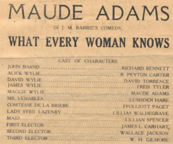 What Every Woman Knows opened in London in September 1908, with Hilda Trevelyan ( Maggie), Gerald du Maurier (John), Lillah McCarthy, Edmund Gwenn, and Mrs. Beerbohm Tree. It was an immediate success. The play came as a Christmas present to Broadway on December 23, 1908, with Maude Adams and Richard Bennett. It has since been continuously popular. Maggie has been played by Helen Hayes ( 1926, 1938); Frances Starr ( 1931); Pauline Lord ( 1931); and Muriel Kirkland ( 1942). In 1946 the American Repertory Theatre revived the play, with June Duprez ( Maggie), Richard Waring (John), Ernest Truex, Philip Bourneuf, Walter Hampden, and Eva Le Gallienne. It was filmed in 1921 with Lois Wilson and Conrad Nagel, and again in 1934.