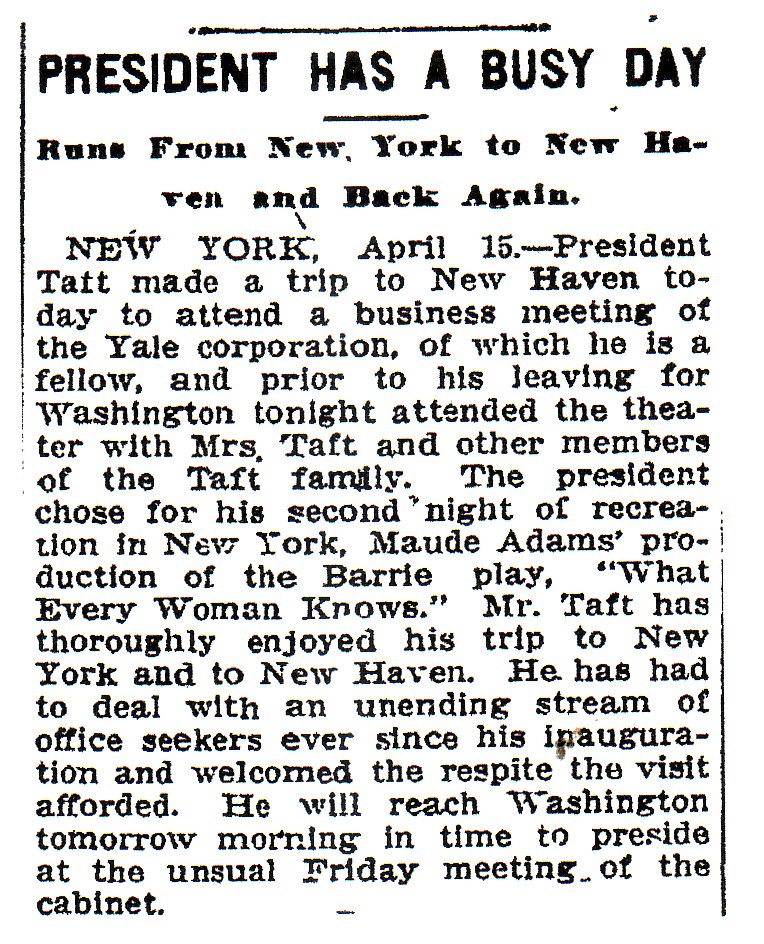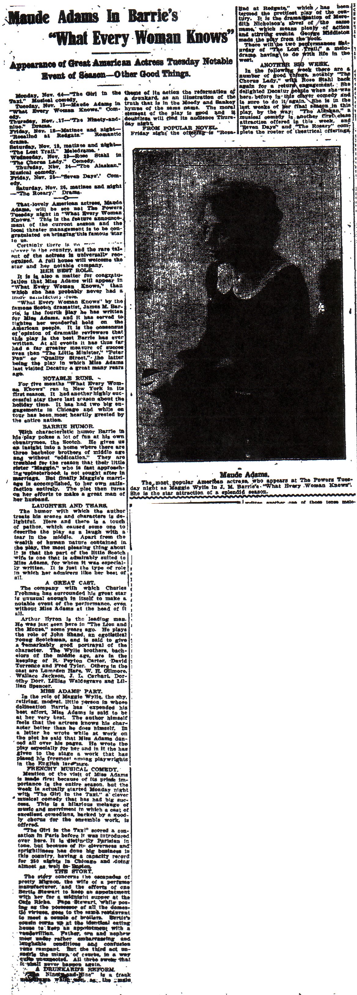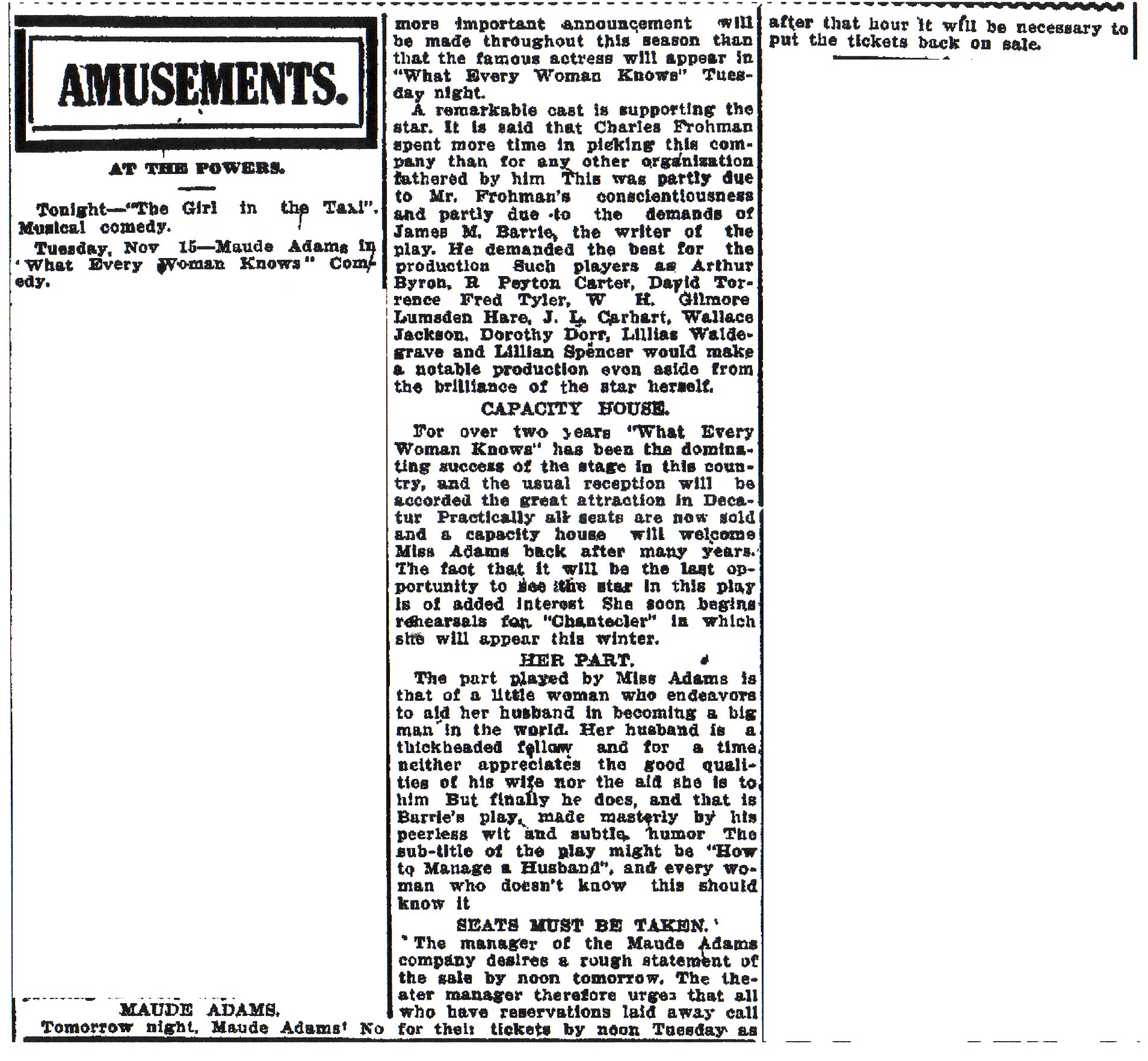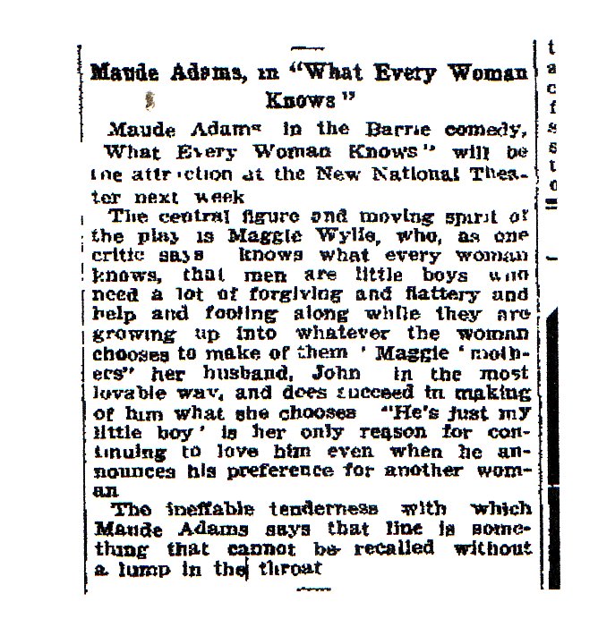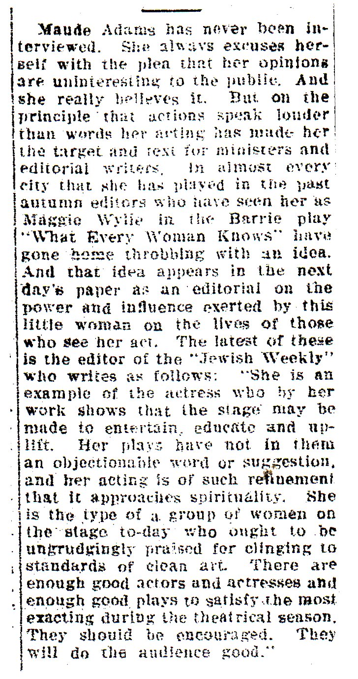 Note in the article on the right that then-president William Howard Taft saw a Maude Adams play, making several Presidents that saw her plays.