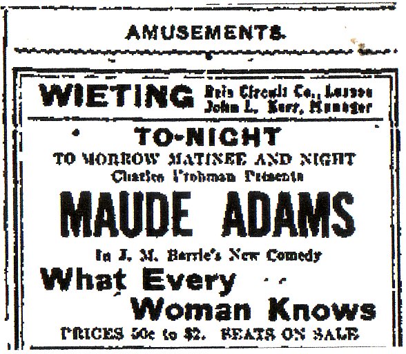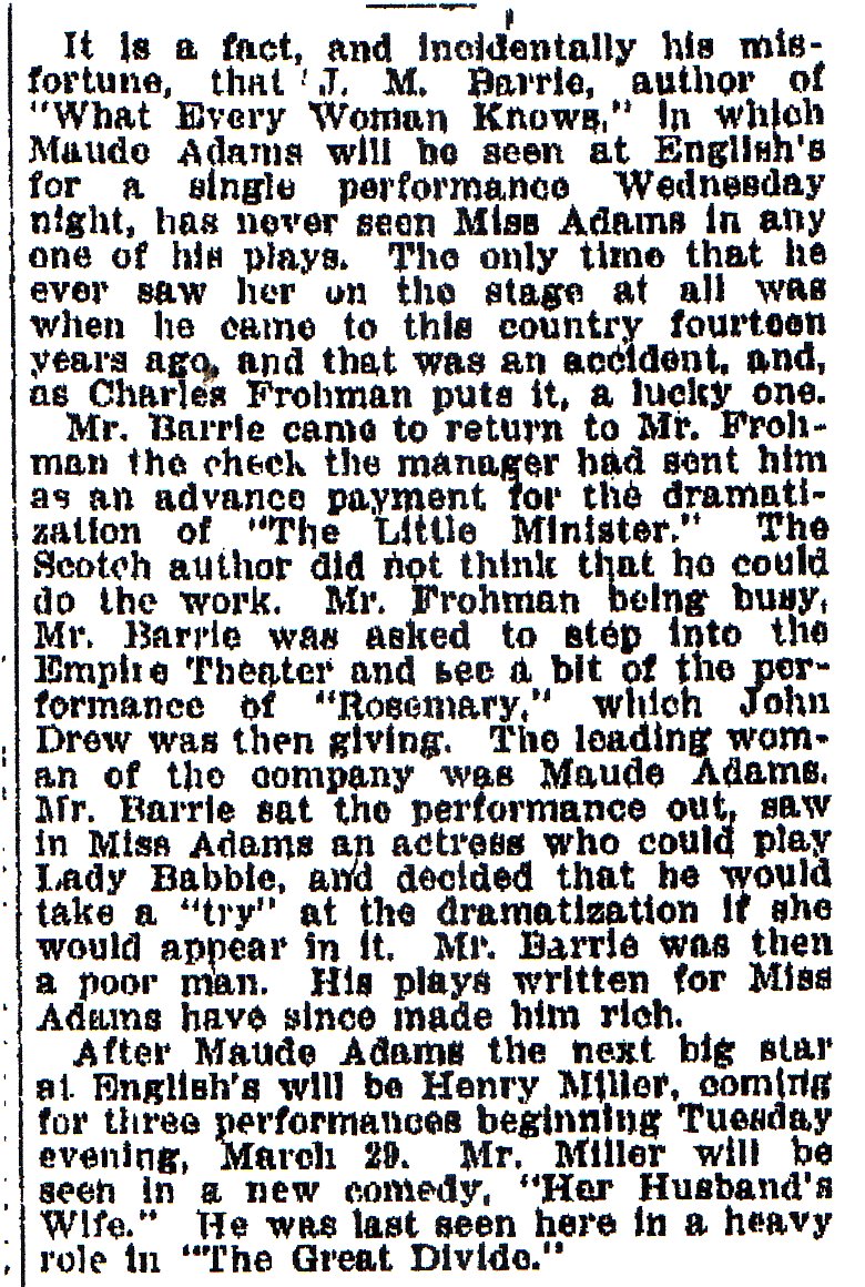 In this four-act play written by James Barrie and produced by Charles Frohman, Maude Adams appeared as the character Maggie. The play opened at the Empire Theater on December 23, 1908 and ran for 198 performances.