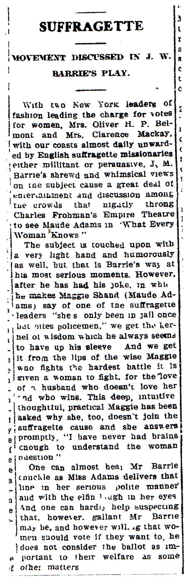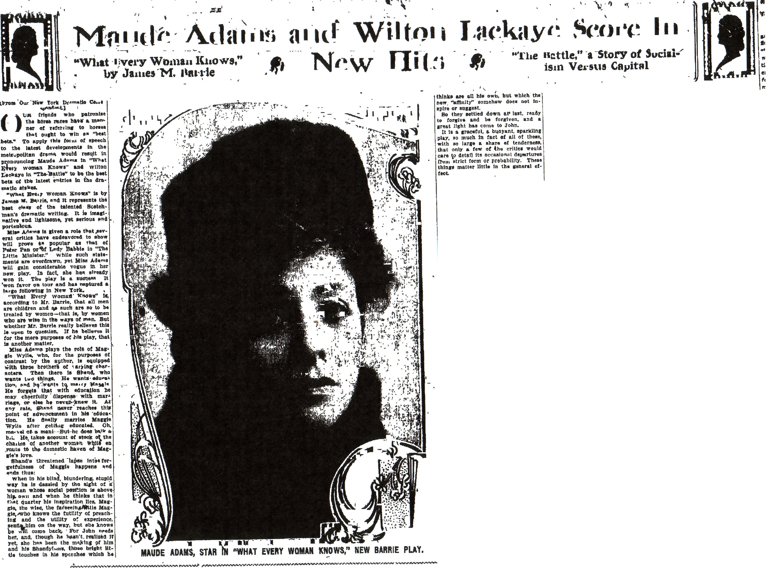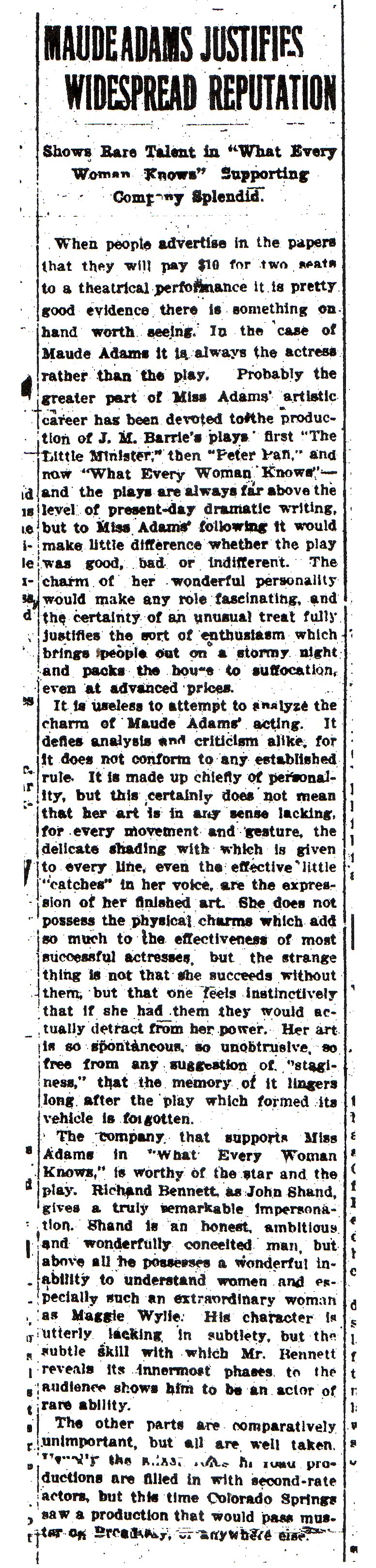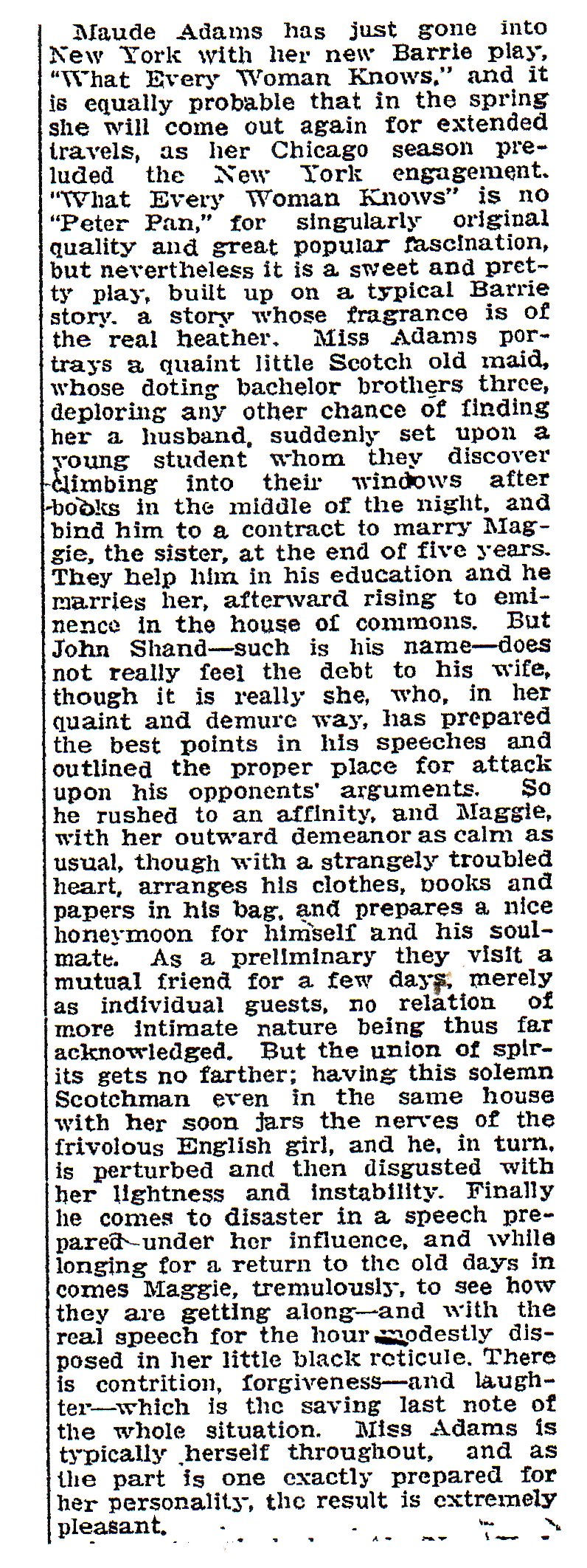 "In the opening act of 'What Every Woman Knows,' for example, Miss Maude Adams, most popular of players, acts very badly. She strives by every little trick at her command to be charming; and the part distinctly calls for a complete absence of charm. Awareness of Maggie's charm should come gradually, not only to John Shand, but to the audience. A large conception of the role of Maggie, which saw it firmly in relation to the entire play, would bring about quite a different impersonation and a better one. ...But Miss Adams has a witchery about her which makes it doubly difficult to visualize a character she is playing apart from her impersonation. It is doubly difficult to convict her of error before the jury of the public. American Magazine, July 1910