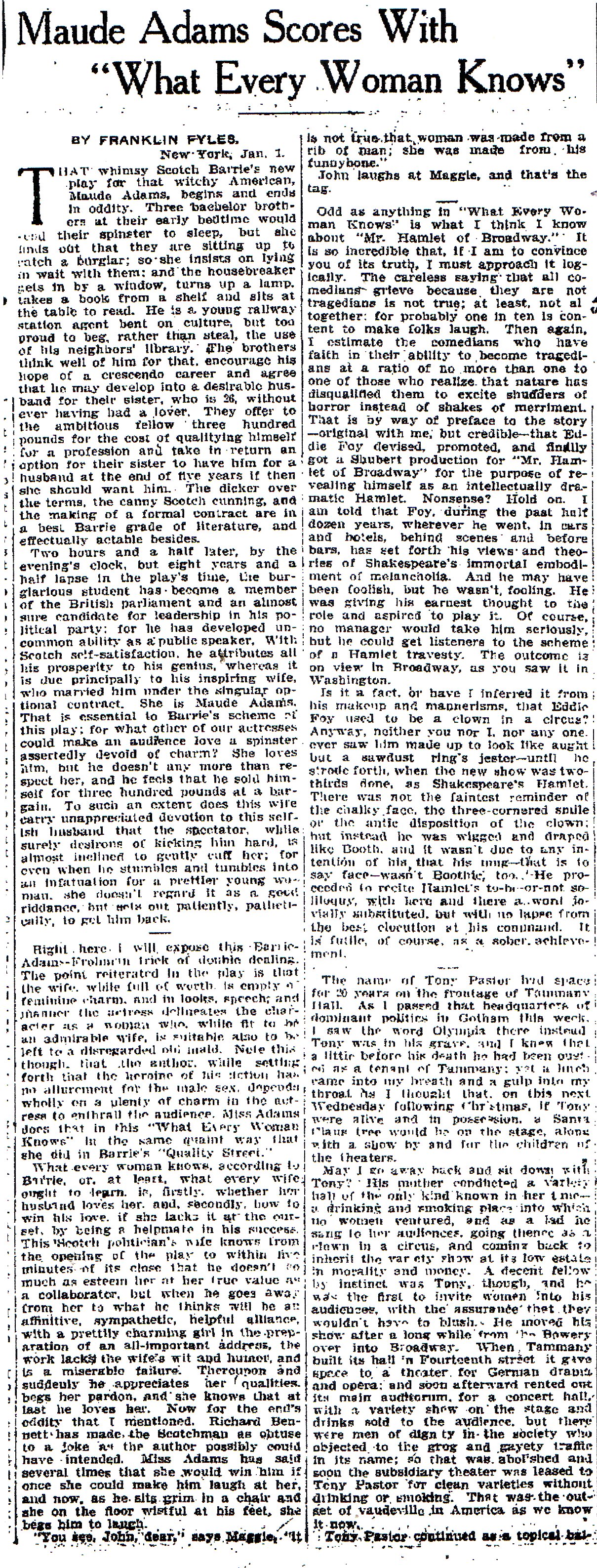 Of the Broadway premiere, The New York Dramatic Mirror ( January 2, 1909) commented: "What every woman knows is that Eve was made not from Adam's rib but from his funny-bone . . . Perhaps it is not his best play, but it is as good as any of the others, no matter how paradoxical that may sound. And the role of Maggie was made for Maude Adams."