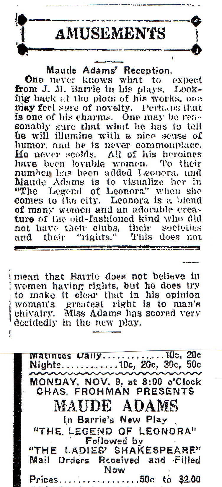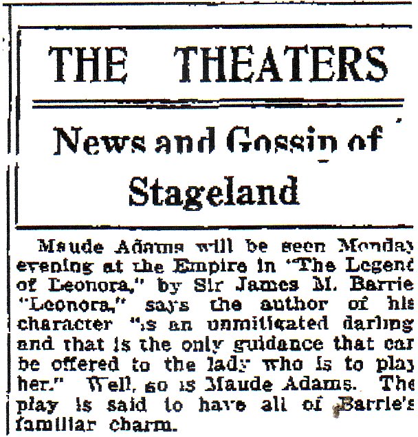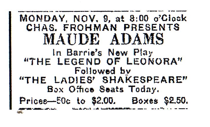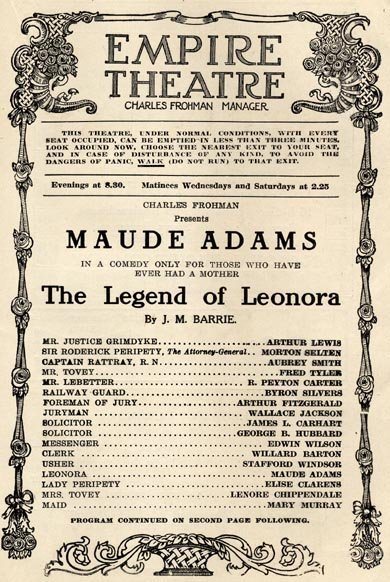 "1914, Charles Frohman presented Miss Maude Adams in The Legend of Leonora-to which name The Adored One had now reverted-at the Empire Theatre in New York on Monday, January 5th; and for Miss Adams at any rate, it was another triumph....It ran for the best part of four months-which broke no records, but was anything but a failure on Broadway-and later Miss Adams added it to her extensive Barrie repertoire. But, of course, it still remained a very queer sort of play."