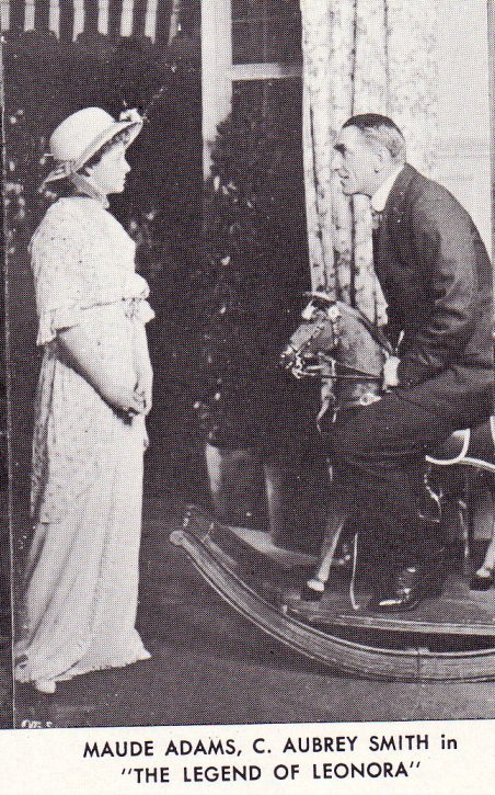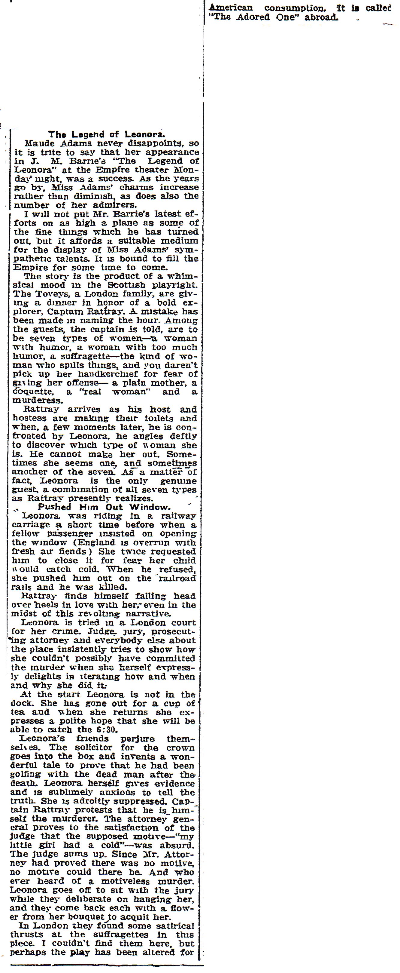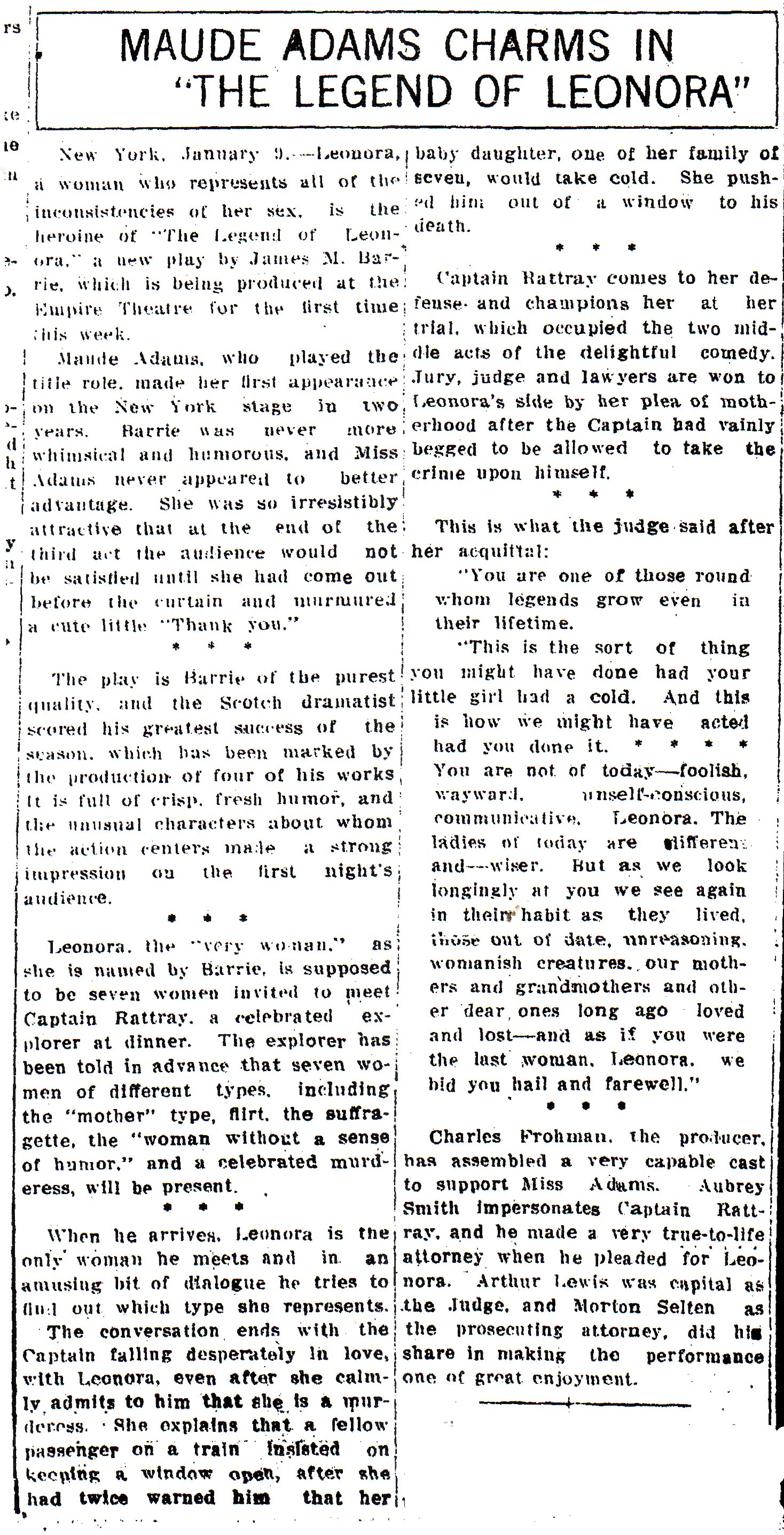 Maude Adams turned again to Barrie for The Legend of Leonora, in which the heroine pushed a cranky man off a moving train because he insisted upon keeping a window open, thoughtless indeed of him inasmuch as Leonora's daughter was suffering from a shifty little cold.