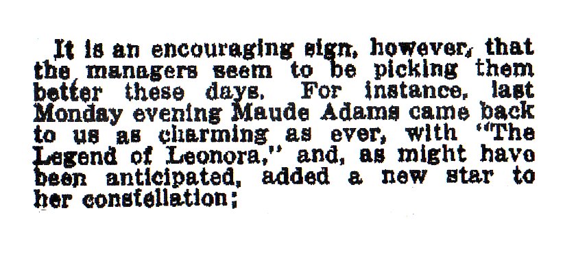 "Maude Adams turned again to Barrie for The Legend of Leonora, in which the heroine pushed a cranky man off a moving train because he insisted upon keeping a window open, thoughtless indeed of him inasmuch as Leonora's daughter was suffering from a sniffy little cold."