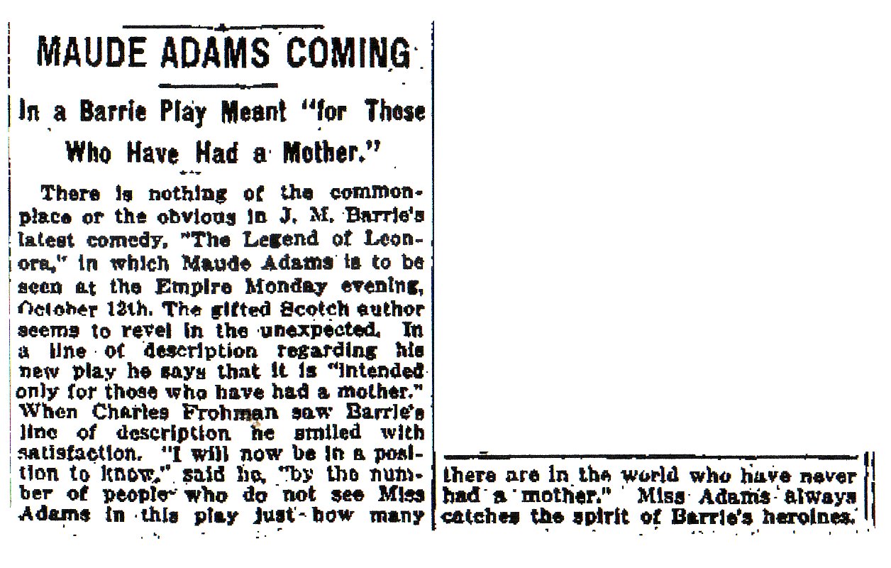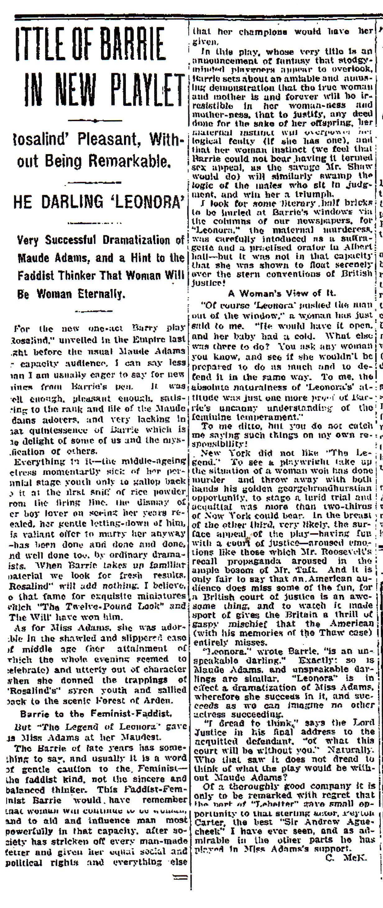 "Never has she so conspicuously demonstrated her unique ability as in this case, and Leonora will have to be credited as her greatest achievement. And never, it might be added, has Barrie been so indebted to Miss Adams for her share in making his work count."