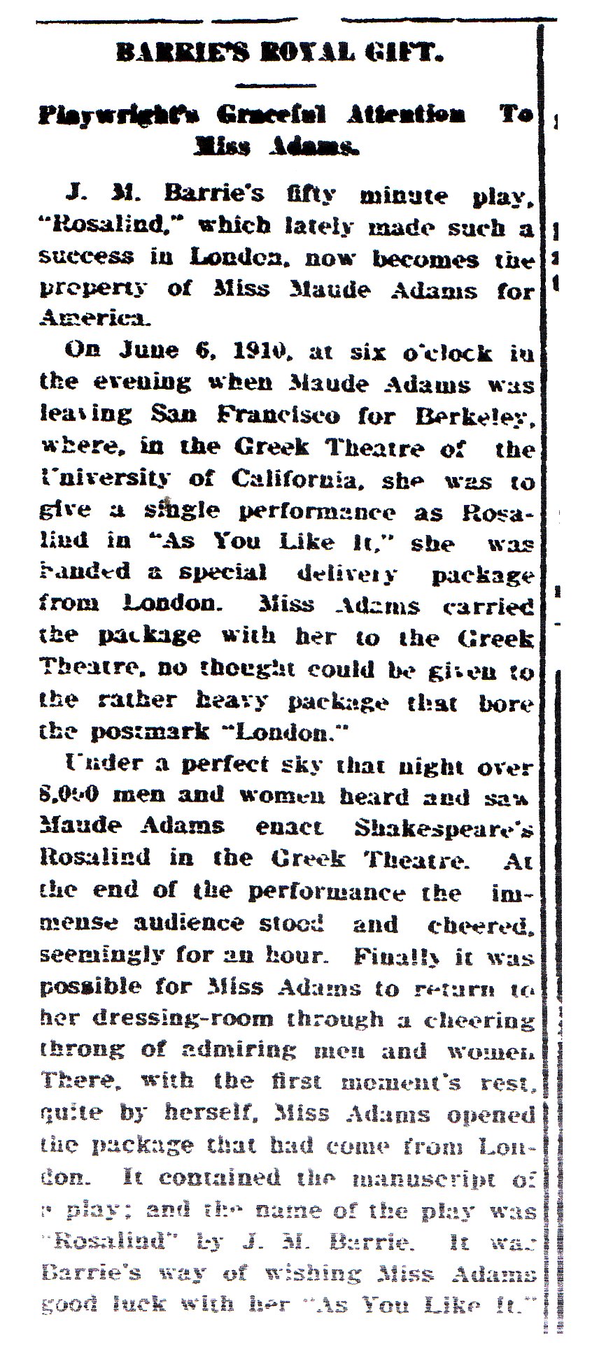 This article, two years before the actual play, refers to the play becoming the property of Maude Adams, meaning that it was based on As You Like It but was limited to one act. It was two years after this article before she did the play itself, though.