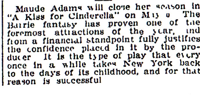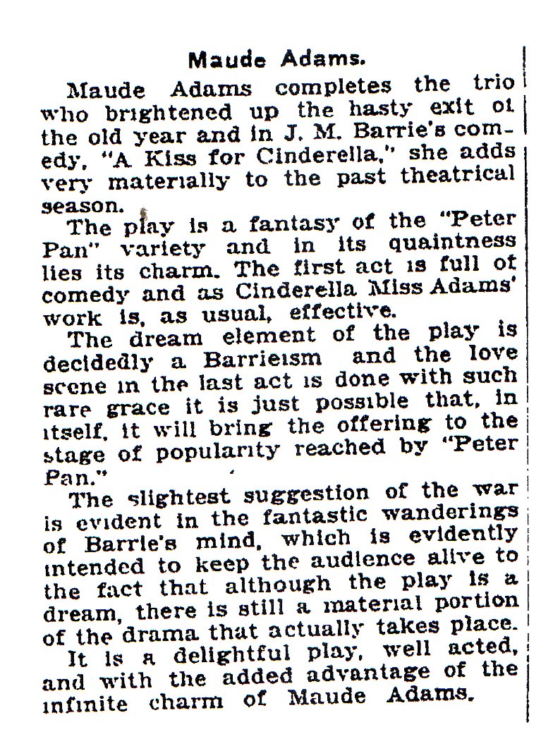 "Maude Adams is utterly winsome, so dauntless and gently pathetic that she almost breaks your heart. It is nearly twenty years since she began building America's idea of what a Barrie heroine should be. There may be some few who, by this time, would ask for a younger actress to play 'Miss Thing', but it is to be hoped that the great majority of us would have risen in our seats at the sight of any such pretender and hissed the brazen creature off the boards."