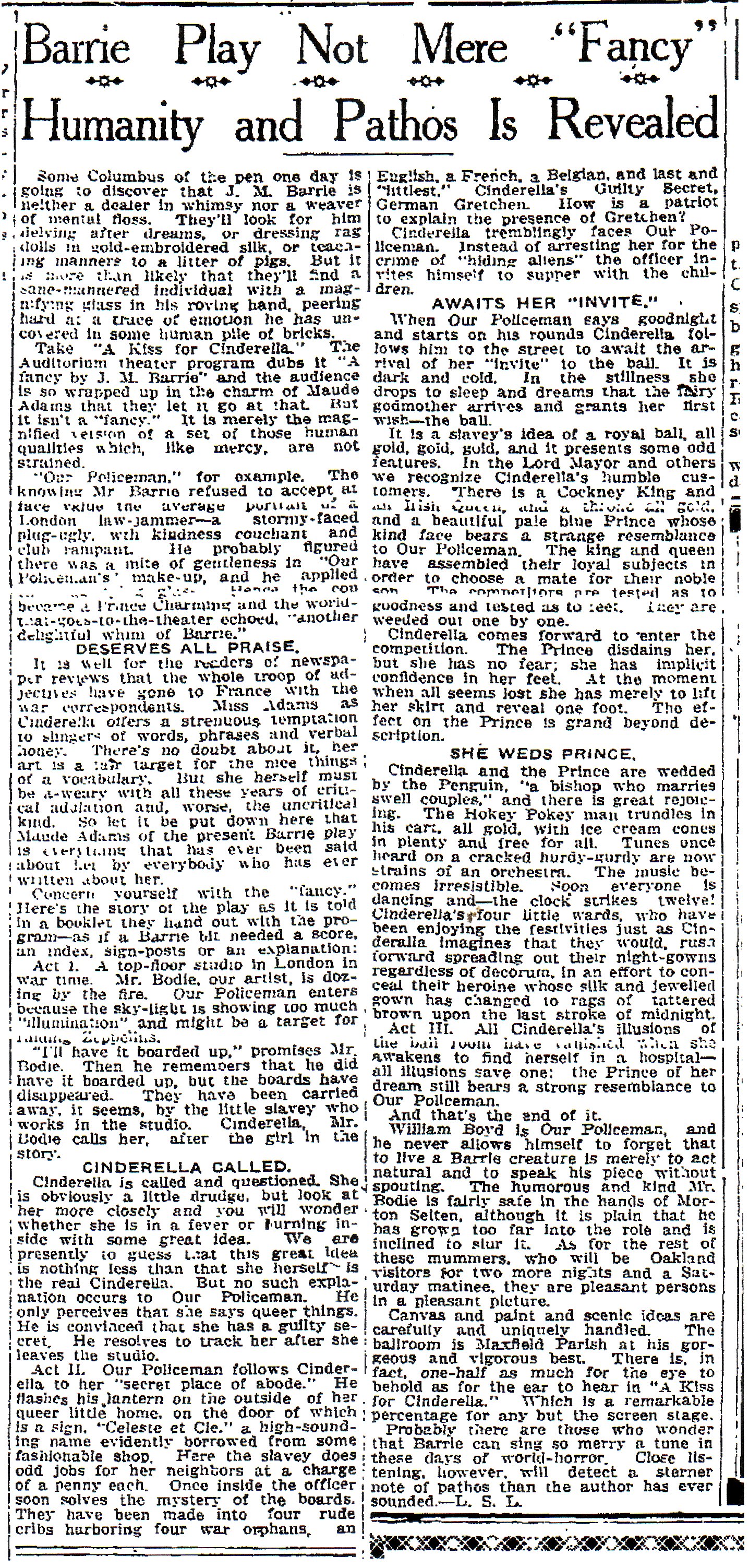 It is extremely unlikely that any other living actress would have carried the part of Cinderella as naturally and effectively as she did. Evening Post, Dec. 26, 1916