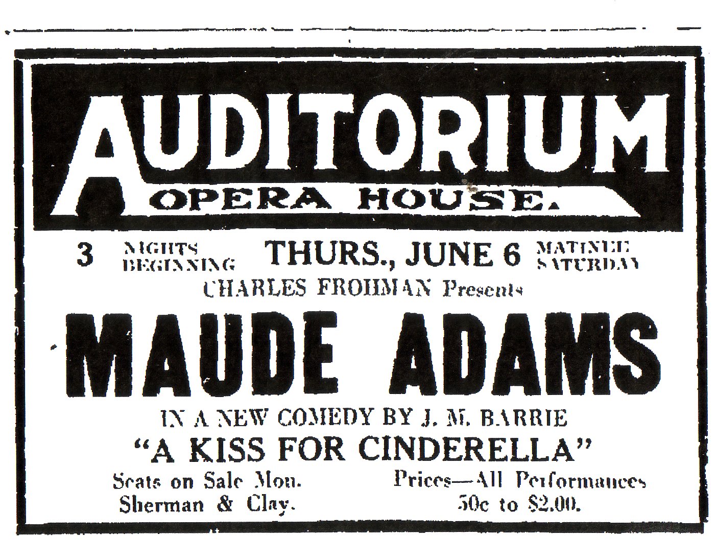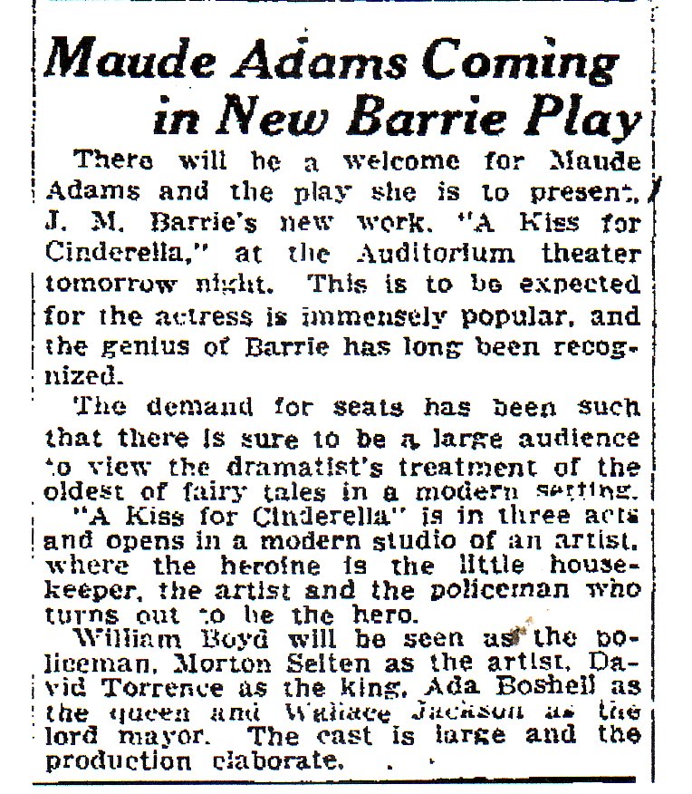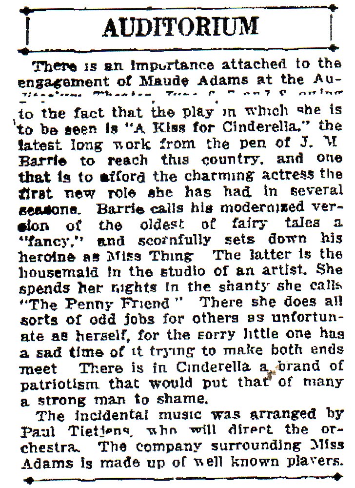 A Kiss for Cinderella, by James M. Barrie, produced at the Empire Theatre, New York, December 25, 1916, by Charles Frohman, Inc., with Maude Adams