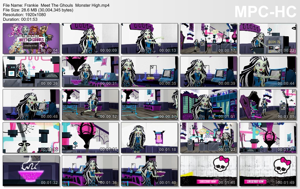 Frankie's in the Monster High science lab. (Shouldn't this be Ghoulia since she's much more into science?) She lived in an abandoned power station (?) She also read all the books tha were there. She makes popcorn.