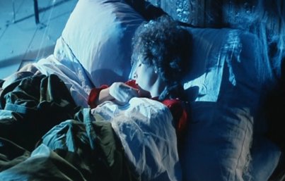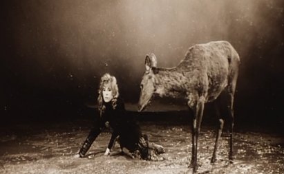 She comes upon the man having sex with another woman. In another scene she bites the guy like a vampire, and in a scene a wolf tears apart some haunch of meat that's been put on the ground.
