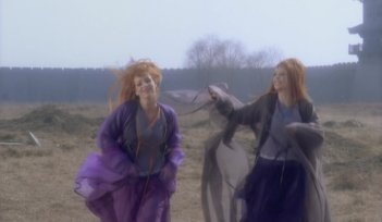 The two women, who are obviously not human, link incredibly long tongues and create a lightning effect but it doesn't stop one of the horsemen from grabbing one of the women and making off with her.