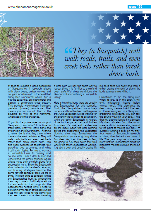 Again, from reports, it does seem that deer are a major food source for the creatures. Considering their size, sometimes eight feet or more, it's probable that they do need a lot of food. It's also interesting that in many reports of people in the woods they go through any bags the person has, obviously searching for food.