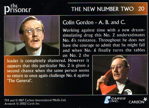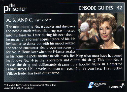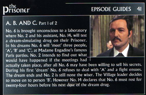 #6 is brought in for some "work." Their experiment involves taking #6's thoughts as electrical impulses and converting them into pictures (something done in the movie 5,000,000 Years to Earth). #2 thinks that #6 was going to sell out to one of three possible people, A, B, and C, and they will drug #6 and watch his brainwave thoughts to figure out which person it was.