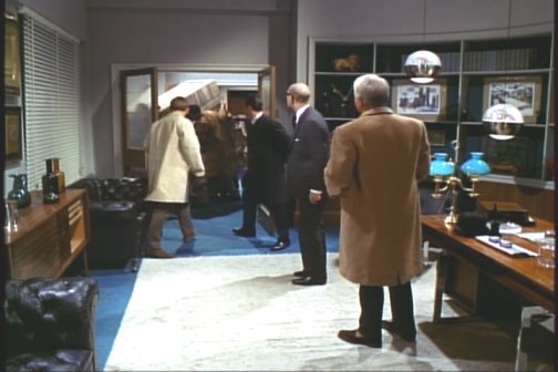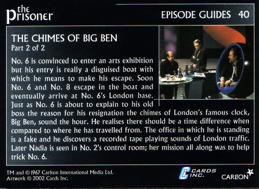 The box is finally delivered to an office. It has people in it that #6 knows, but the most obnoxious one of them keeps asking him why he resigned. Big Ben (supposedly) chimes, and #6 notices that it's not the correct number of chimes. It turns out, of course, that the whole thing was a set-up and he's back in the Village.