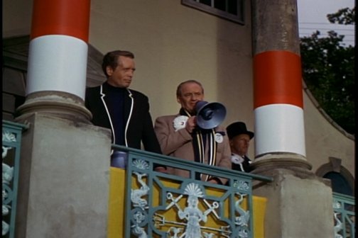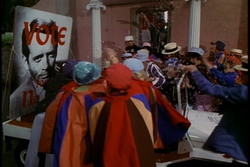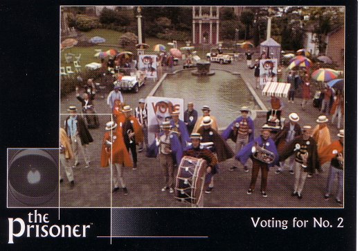 Outside, a demonstration supporting Number Two commences, complete with marchers, music, and a Village buggy with an election poster. Number Two and the Prisoner then go out, and Number Two begins to address the crowd. The people have been chanting "Number Two, Number Two" and other empty-headed phrases. As Number Two talks to them, they support everything he says. then, Number Two introduces the Prisoner.
