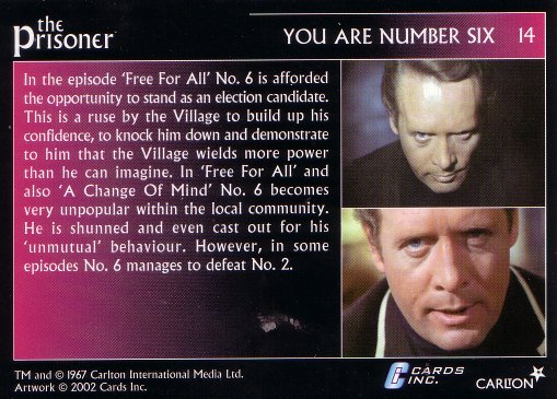 Number Two encourages the Prisoner to continue. The Prisoner says he wants to find out who are the Keepers, and who are the prisoners. He then announces he will run for the office of Number Two, and the current Number Two leads the crowd in a round of applause.Blank placards that were in the group turn around and reveal a photograph of the Prisoner, and the "Vote fo No. 6" logo, another example of how things can happen in the Village without any warning.