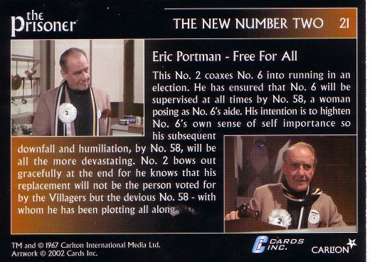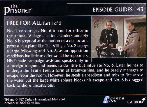 The Prisoner is then introduced to a girl, Number 58, who speaks an odd, apparently foreign language. Number Two tells the Prisoner that it is the start of their election campaign, and asks if he intends to run for office; namely, the office of Number Two.