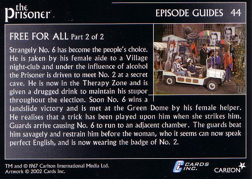 The Prisoner is then offered transport for the election, with the foreign-speaking woman as his driver. The Prisoner is on the way to the Town Hall for a meeting when two reporters catch up to his buggy and begin asking questions. One asks the Prisoner how he intends to handle his campaign, and the Prisoner replies "No comment," to which the reporter records "intends to fight for freedom at all costs."